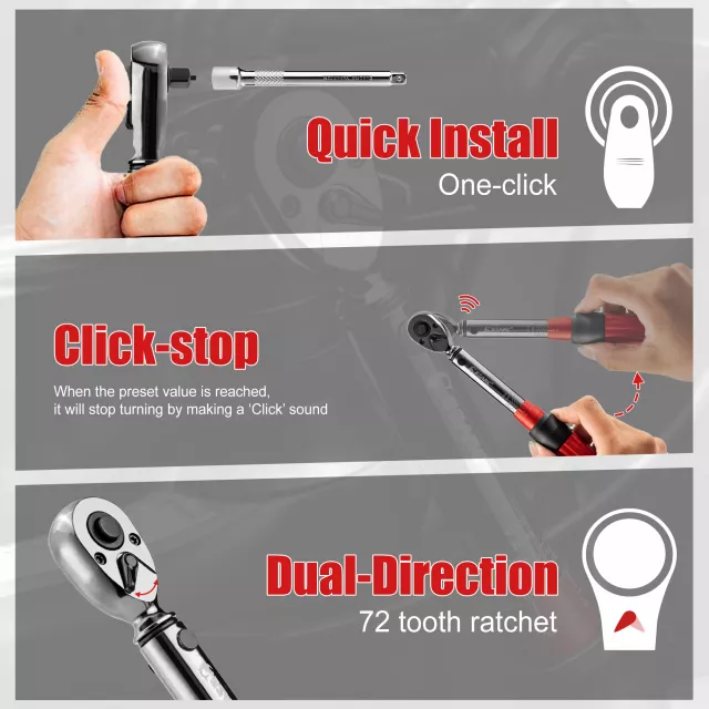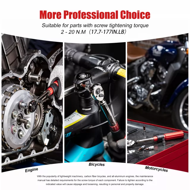 This set is engineered for effortless use. The quick-release 72-tooth ratchet head ensures smooth operation in both clockwise and counterclockwise directions, while the easy-to-set locking system prevents accidental changes during use. When your set torque value is reached, a tactile click or subtle vibration lets you know—so you can stop applying force and avoid overtightening. It’s smart, safe, and simple to use, even at lower settings under 5 Nm.