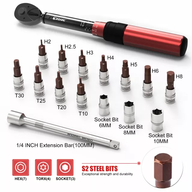 Upgrade your tool kit with this 1/4 inch torque wrench set—your go-to solution for accurate, reliable torque control. Whether you’re tuning your mountain bike, adjusting an e-bike, or fine-tuning a motorcycle, this versatile tool delivers consistent performance when it matters most. With a torque range of 2 to 20 Nm (17.7 – 177 in-lb), it’s perfect for delicate bike components like seat clamps, brake rotors, and chain sets. No more over-tightening or damaging expensive parts—just precise control with every turn.