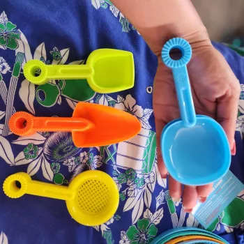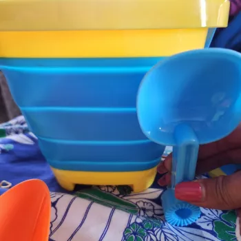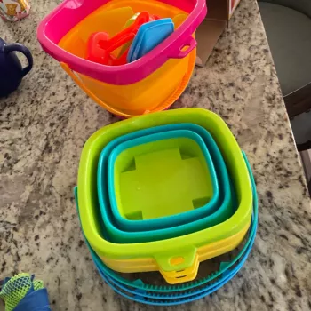 This sand toy set has brought so much joy to our family outings! It's complete with everything you need for fun in the sun - buckets, molds, shovels...you name it! And everything folds flat which is great when packing for a day out or vacationing. The bright colors are still vibrant after many uses too!