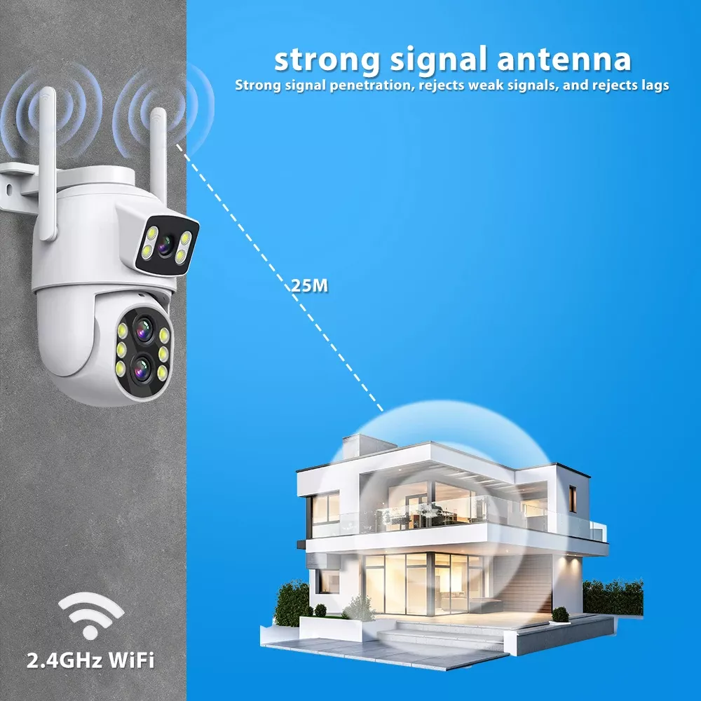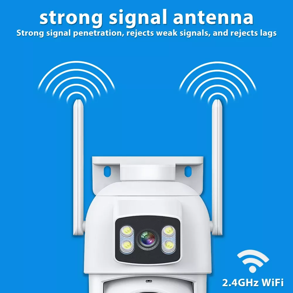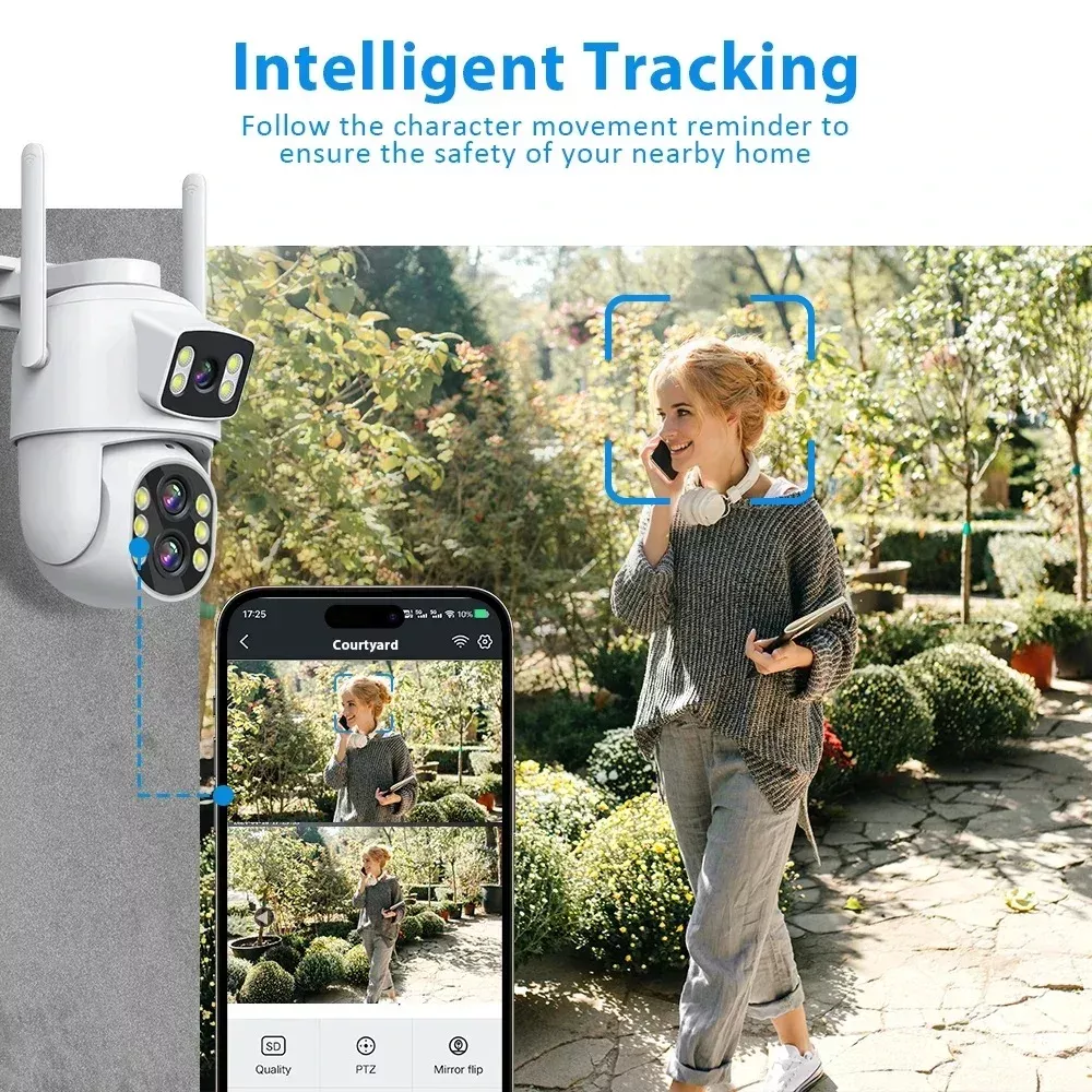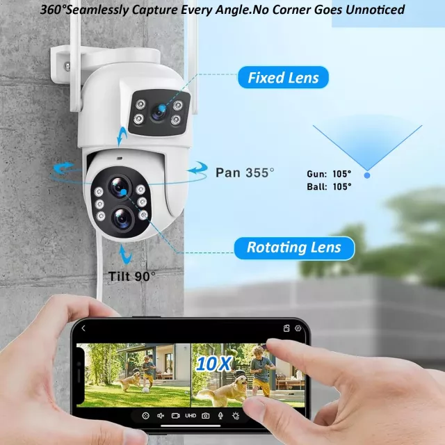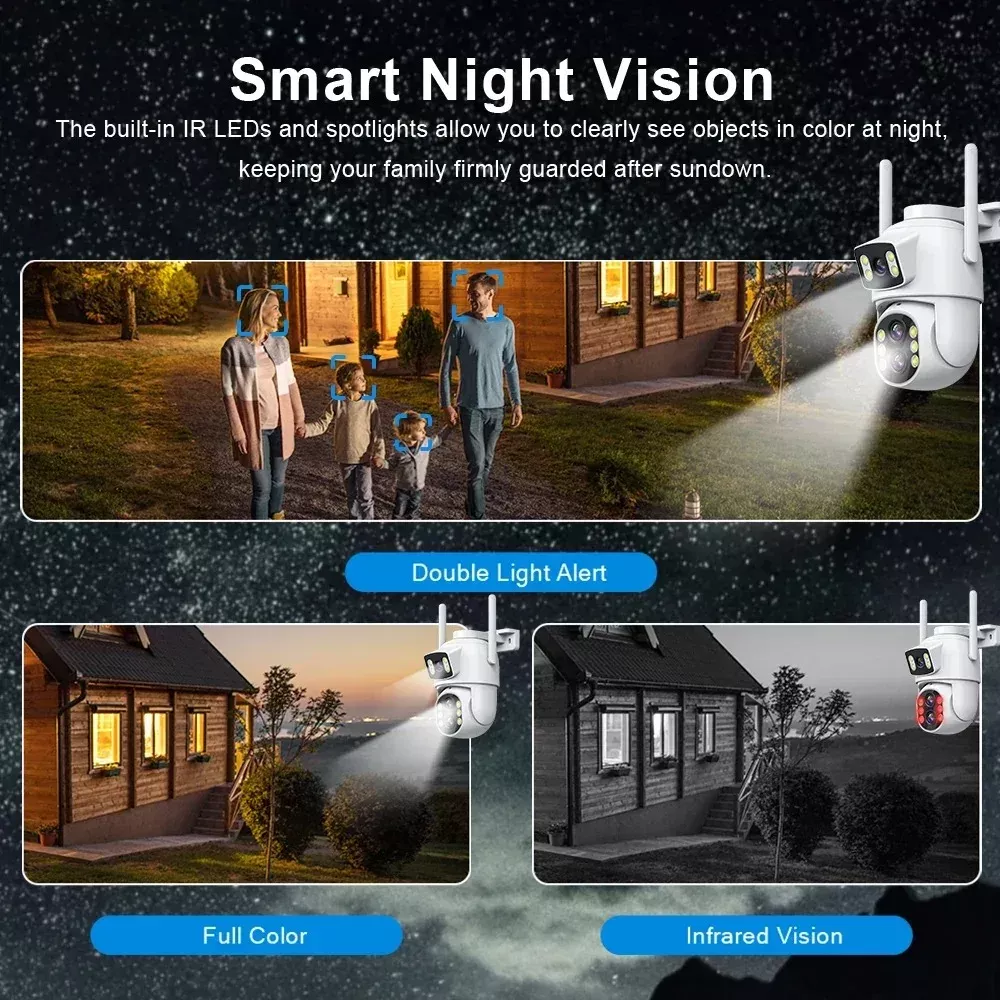 With two lenses—one fixed and one PTZ (pan-tilt-zoom)—you get the power of two cameras in one compact unit. Monitor two directions simultaneously and zoom in up to 10X to catch the finest details in real time. Whether it’s day or pitch-black night, the combination of 8 infrared LEDs and 4 white LEDs ensures full-color, crystal-clear images around the clock. From deterring intruders to checking in on loved ones, this camera has you covered—anytime, anywhere.
