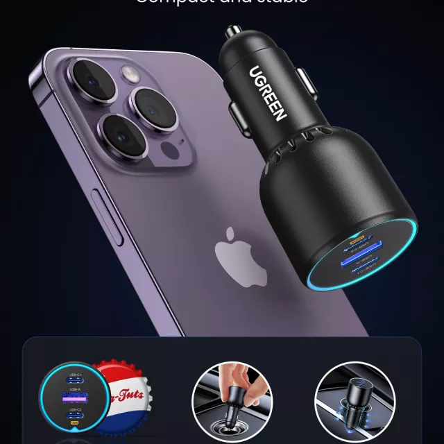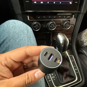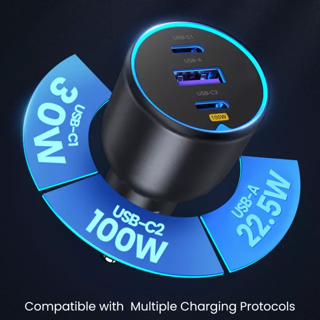 Equipped with two USB-C ports and one USB-A port, this compact charger lets you charge up to three devices at once — all while maintaining impressive speed and efficiency. Compatible with major fast charge protocols, including Samsung Adaptive Fast Charge, Huawei FCP, Qualcomm Quick Charge, and USB PD, it’s the perfect companion for drivers who demand more from their tech accessories.
