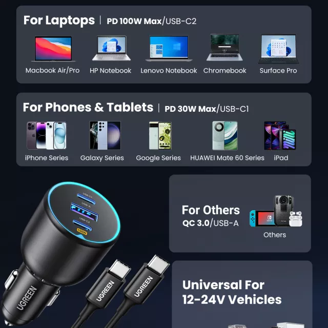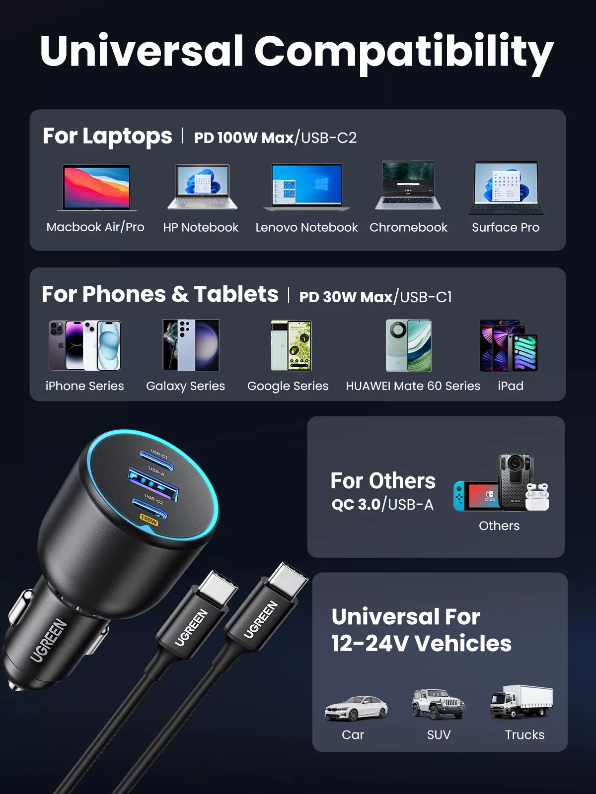 Perfect for: Daily commutes, long road trips, family outings, and rideshare drivers who need to keep multiple devices charged. Ideal for charging phones, tablets, power banks, dash cams, GPS units, and laptops while driving.