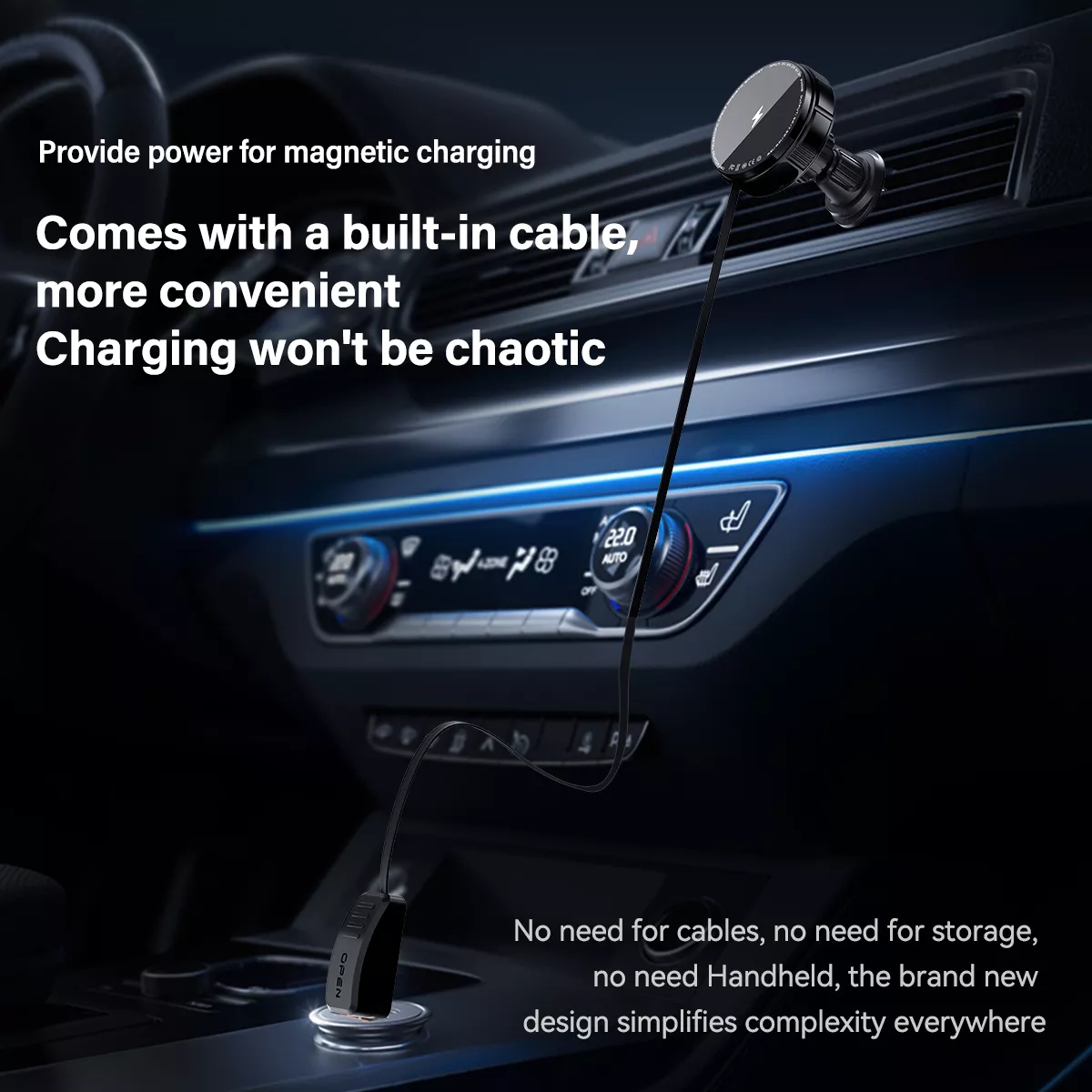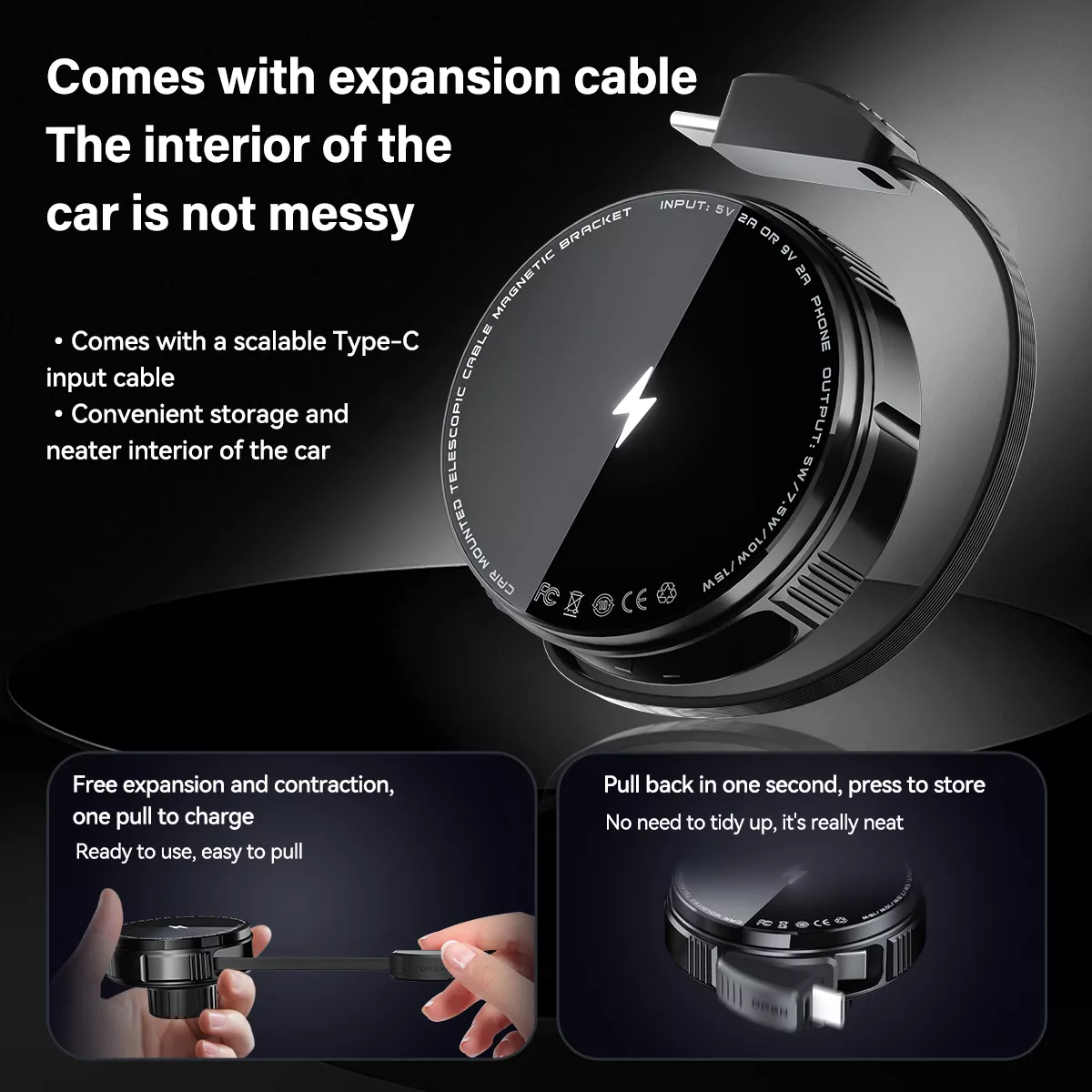 This charger delivers a strong 15W wireless charge, compatible with the latest iPhone models and Samsung phones, making it ideal for almost any modern smartphone. The magnetic holder securely grips your phone, so there’s no need to worry about drops or slips—even on bumpy roads. The built-in 70-inch retractable cable adds flexibility, letting you easily plug in your car’s power source while keeping your dashboard neat and clutter-free.