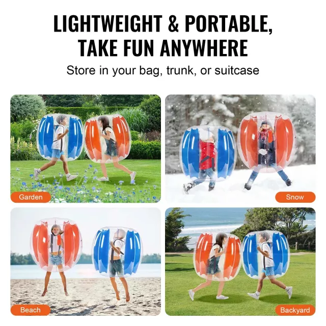 What sets our inflatable bumper balls apart from the rest? First, they’re made with high-quality, explosion-proof PVC that guarantees durability and prevents air leaks. The thickened PVC ensures that these bubble balls will endure countless bumps, rolls, and hours of fun. Additionally, the integrated soft handles and widened shoulder straps are designed for a secure and comfortable fit, so players can focus on the game and have fun without worrying about safety.