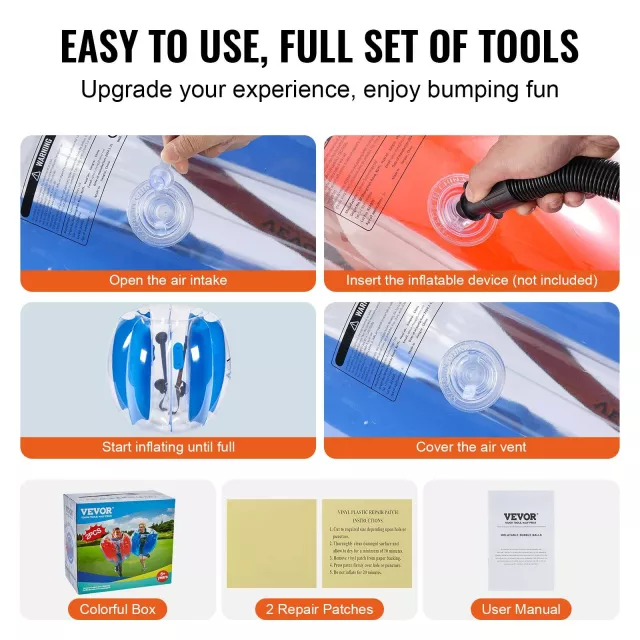 Setting up your inflatable bumper balls is quick and hassle-free. Just follow the easy-to-understand instructions, inflate the balls with an air pump, and tighten the valve to get the game started. Each set also includes 2 repair patches for fixing small holes, ensuring that your bumper balls remain in top condition for years of fun. The advanced valve system with tight sealing ensures long-lasting play, and with proper care, the fun never has to stop!