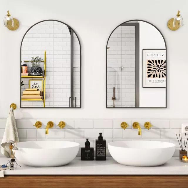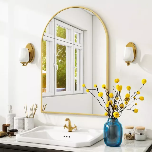 Add a touch of charm and sophistication to your space with this 20 x 30 inch arched wall mirror. Featuring a sleek metal frame and a smooth arched top, this mirror blends classic beauty with modern design. Whether you’re styling your bathroom, entryway, or bedroom, this piece creates a striking focal point while offering clear, functional reflection. Its curved silhouette softens hard lines in a room, making it both visually appealing and practical for everyday use.