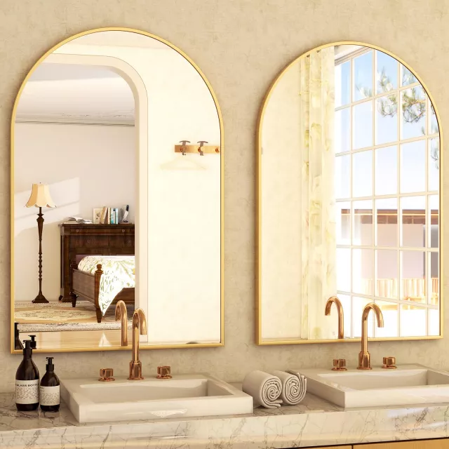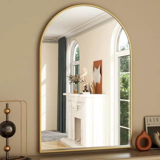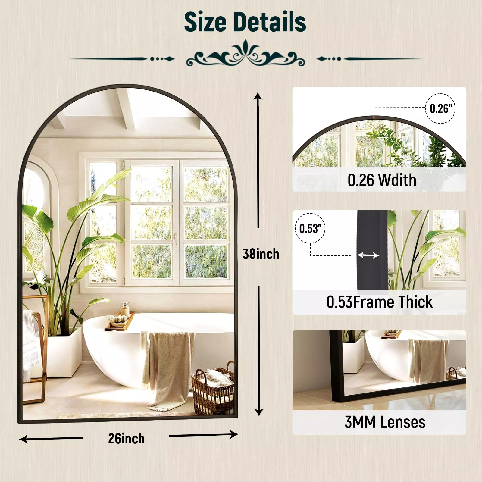 Elevate your interior with this 26×38 inch arched wall mirror that blends timeless charm with modern minimalism. The soft curve of the arch top adds a refined, elegant silhouette, while the sleek metal frame gives it a clean and contemporary finish. Perfectly sized for bathrooms, vanities, entryways, or bedrooms, this wall-mounted mirror effortlessly enhances any space with its sophisticated appeal and practical function.