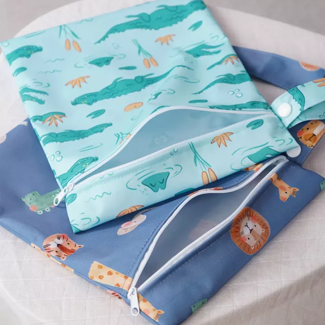 Crafted from waterproof PUL material and measuring approximately 7 x 10 inches (18 x 25 cm), these bags offer reliable moisture protection without taking up space. Each bag features a smooth zipper closure for secure storage, along with a snap handle for easy attachment to strollers, diaper bags, or gym lockers. With playful, fashion-forward prints and a unisex design, these bags are as stylish as they are practical.