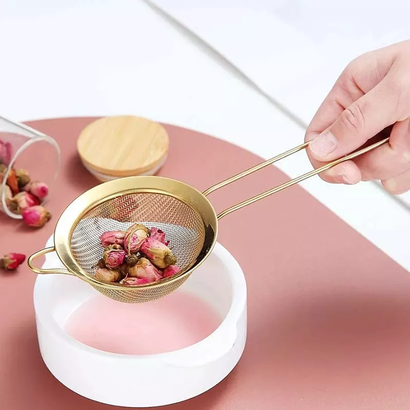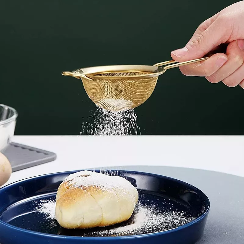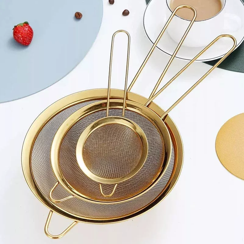 Upgrade your kitchen with this elegant and highly functional 3-Piece Fine Mesh Strainer Set. Crafted from durable 304 stainless steel and plated with a stunning titanium gold finish, these strainers combine timeless style with everyday practicality. Whether you’re sifting flour for baking, rinsing quinoa, or straining your favorite loose-leaf tea, this set offers the perfect tool for the task.