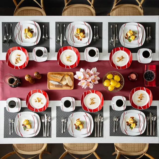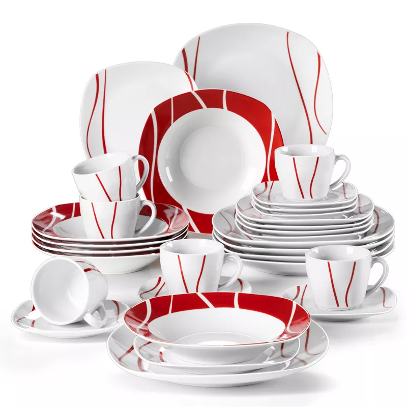 This dinnerware set isn’t just beautiful—it’s made for real life. Whether you’re serving a hearty stew in the deep soup plates or enjoying coffee with dessert, each piece is designed with balance, comfort, and elegance in mind. The porcelain construction ensures long-term use, while the vibrant red accents bring a fresh, modern flair to your table.