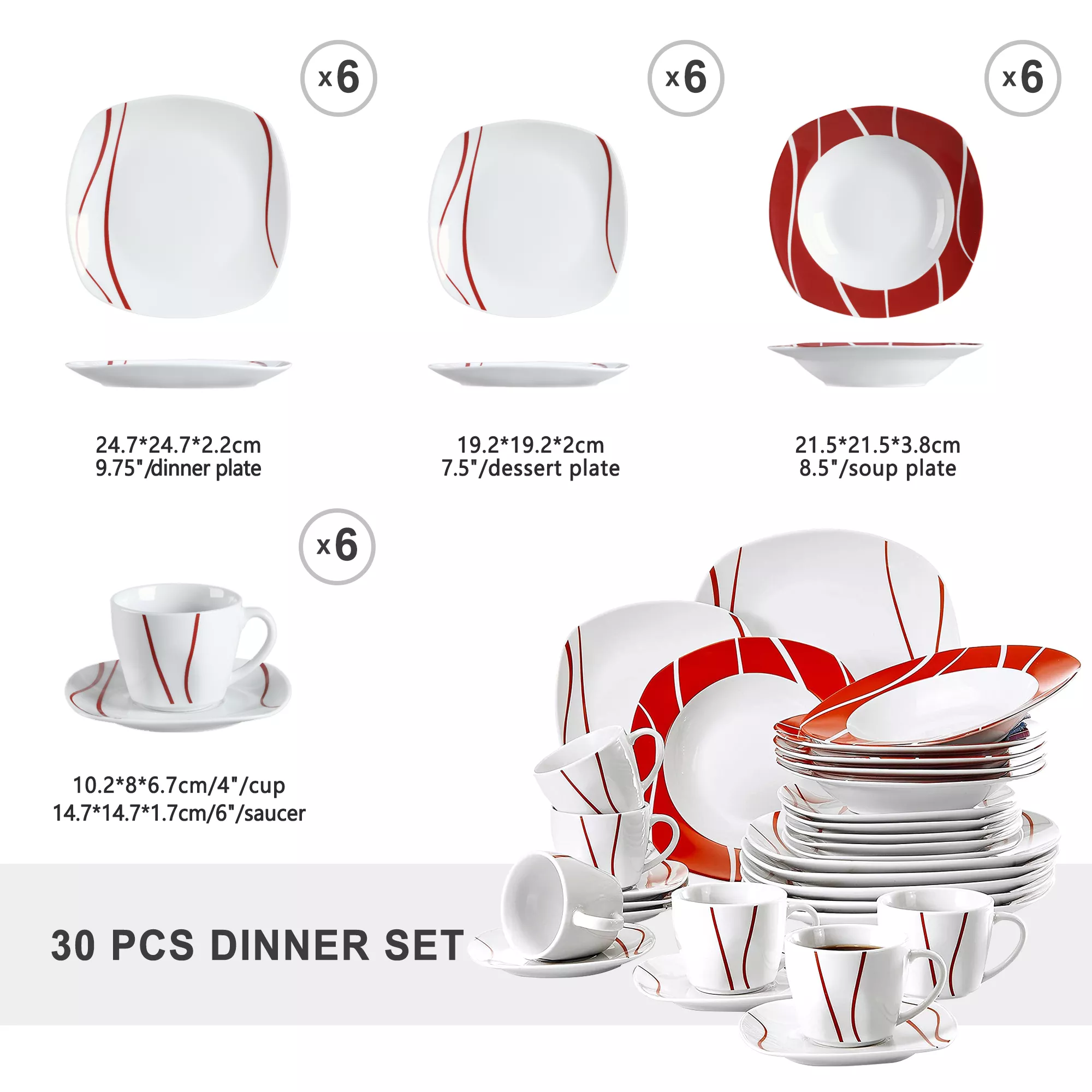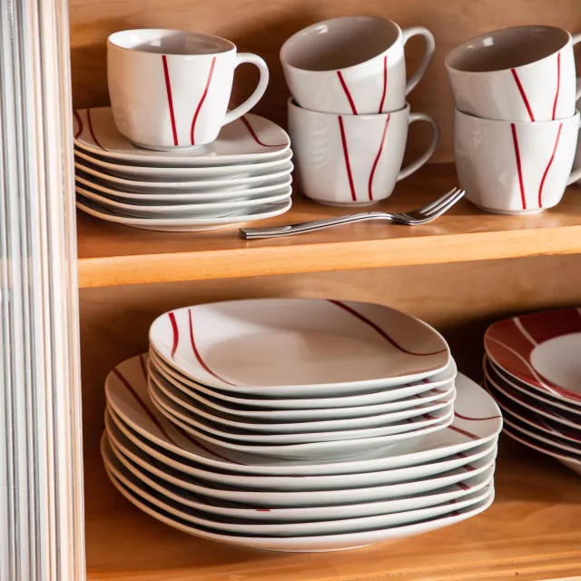 Make every dining occasion feel special with this 30-Piece Porcelain Dinnerware Set, featuring bold red stripes against a smooth ivory white finish. Designed for effortless elegance, this full dinner service includes everything you need for six guests—cups, saucers, dessert plates, soup bowls, and dinner plates. Whether it’s a casual family dinner or a festive holiday gathering, this versatile set brings charm and functionality to the table.