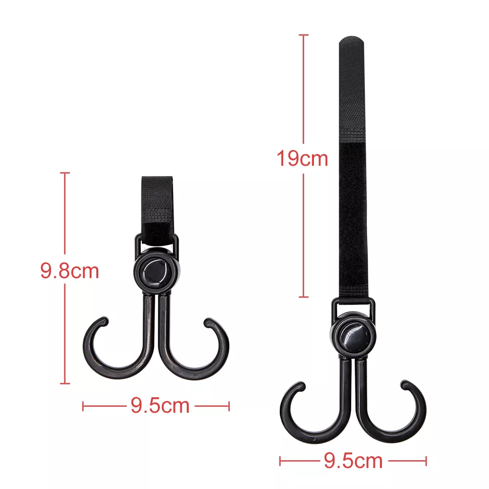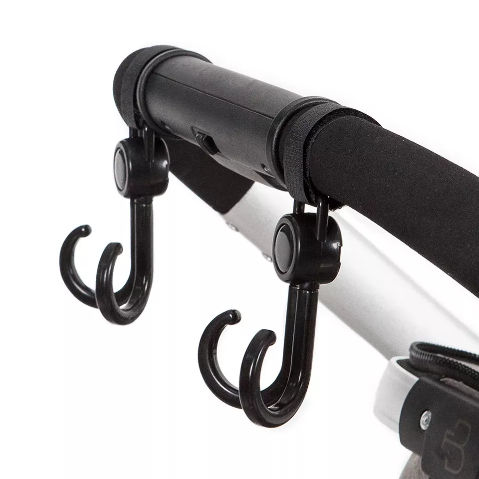 Each hook rotates 360 degrees, allowing you to adjust it in any direction you need. Made from high-quality, durable plastic, these hooks are lightweight yet strong enough to hold heavy bags without breaking or bending. The sleek black finish complements any stroller style while blending in seamlessly with your gear. Their universal fit ensures compatibility with most strollers and carts, and the easy-clip mechanism makes them simple to use and move between different setups.
