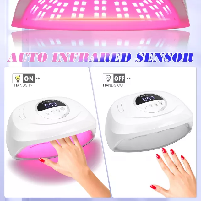The nail lamp features a user-friendly LCD screen that displays drying time, making it simple to monitor your session. The smart sensor turns the lamp on and off automatically when you insert or remove your hands or feet, offering a seamless, hands-free experience. With four adjustable timer settings — 10, 30, 60, and 99 seconds — you can customize your drying time to suit different types of gel polish and nail art applications.