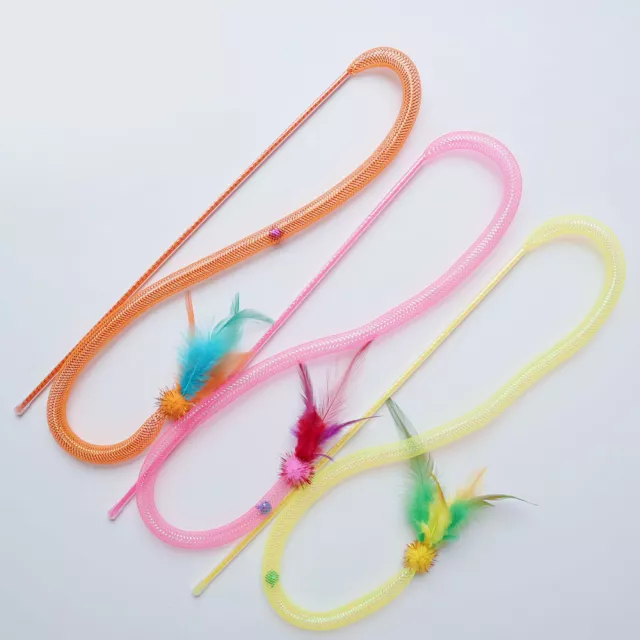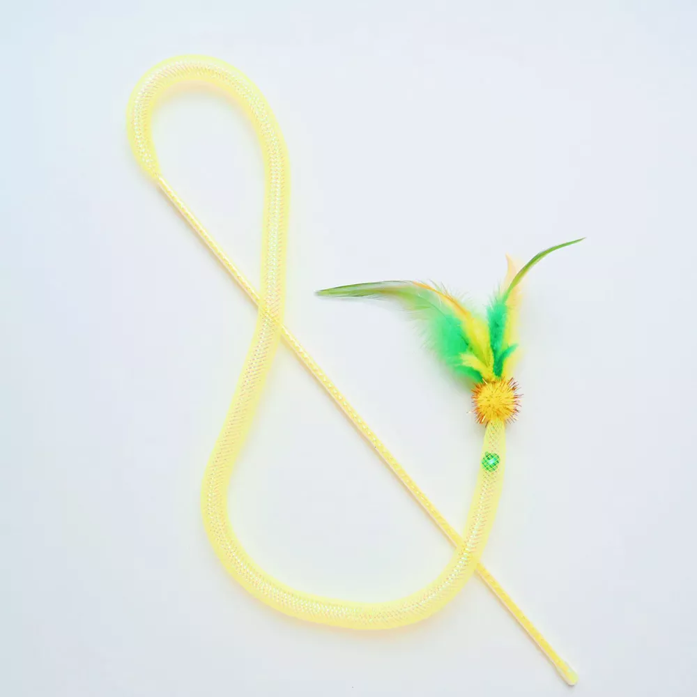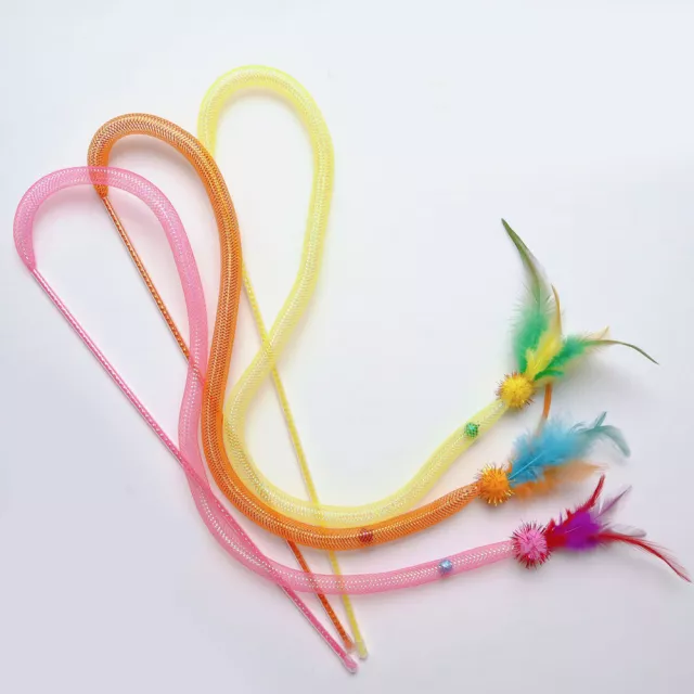 Each cat wand is 15.7 inches long, ideal for keeping your hands safely away while your cat leaps and pounces. The feather materials are lightweight and irresistible to cats, while the elastic mesh tube adds an extra texture for tactile interest. Made from safe plastic and natural feathers, this set contains no harmful chemicals, ensuring your pet’s safety during enthusiastic play. These toys are simple yet effective in capturing your cat’s attention, suitable for kittens and adult cats alike.