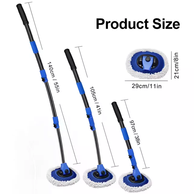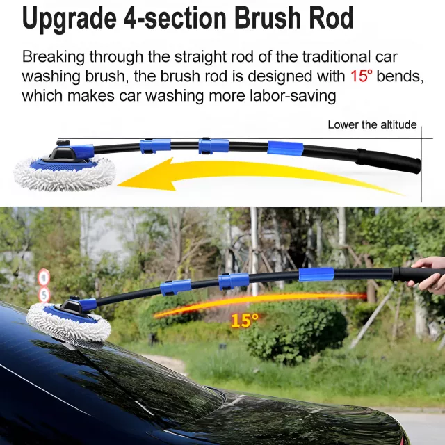 Make car washing easier, faster, and safer with our 4-Section Telescopic Car Wash Brush. Designed for versatility and ease of use, this flexible car wash mop features a four-section telescoping handle and a soft chenille cleaning head, making it perfect for reaching every corner of your vehicle without bending or stretching. The specially designed 15-degree curved rod lets you glide over surfaces smoothly, minimizing the risk of scratches or paint damage.