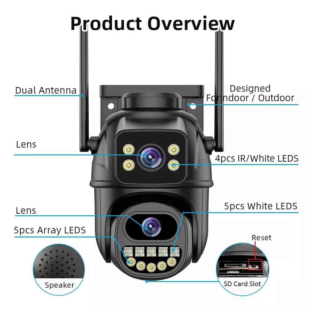 • Dual Lens Dual Screen: View two video streams simultaneously on the app—a fixed angle and a PTZ (pan-tilt-zoom) perspective for comprehensive coverage.