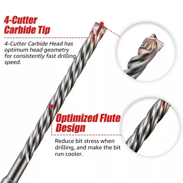 The SDS-Plus shank ensures quick bit changes and secure fit in all compatible rotary hammer drills. Whether you’re using a corded or cordless tool, the anti-slip shank design locks in tightly, reducing slippage and increasing drilling efficiency. Carbide tips provide exceptional wear resistance and deliver consistently fast speeds—even when cutting through rebar or dense concrete.