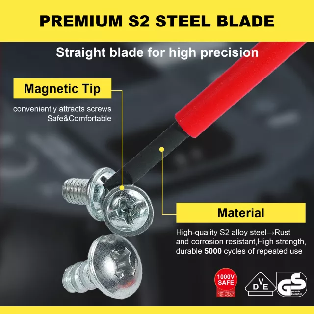 Each screwdriver is crafted from premium S2 alloy steel and undergoes a specialized phosphating process for increased hardness, superior wear resistance, and protection against corrosion. Every tool is individually tested to ensure it can withstand up to 1000 volts AC, giving you peace of mind when working around live wires. Certified to meet rigorous international standards, this set delivers the performance and reliability professionals demand.
