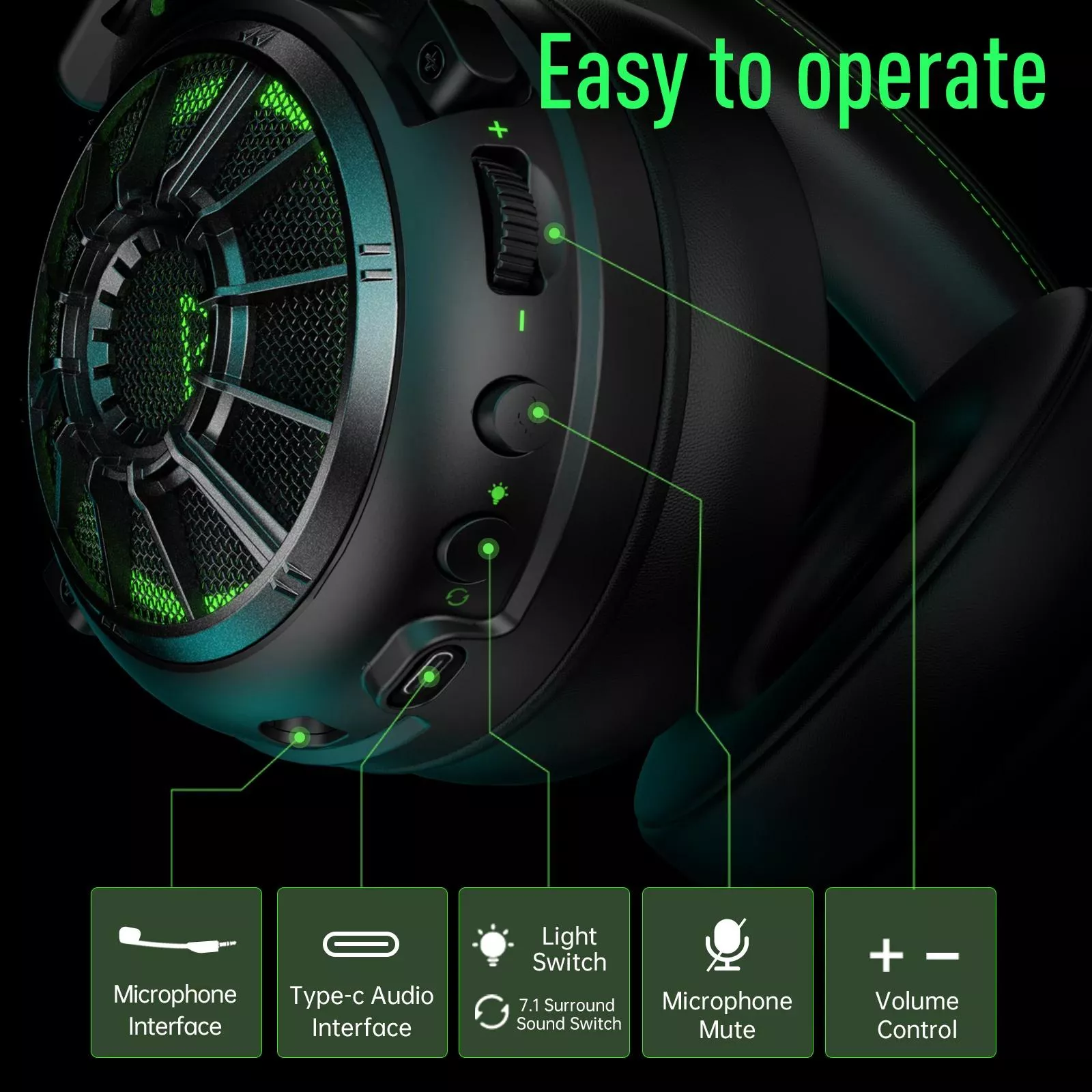 This wired headset includes three detachable cables to connect effortlessly to PCs, consoles, tablets, and phones (except devices with Lightning ports). Switching between game and music modes is simple with one key, and you can toggle the powerful 7.1 surround sound on or off instantly. The built-in LED light adds a cool, immersive vibe to your setup.