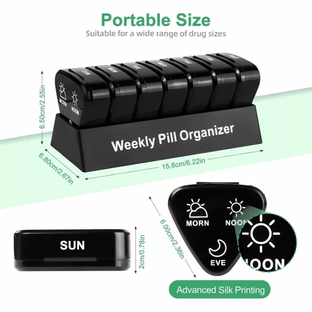 This pill organizer has truly simplified my daily routine. It's compact yet spacious enough to fit all of my vitamins and medications, which I can now sort into morning, noon, and night compartments. This feature alone helps me keep track of what I've taken and when - no more second guessing or missed doses! The seven individual boxes are a game-changer too; being able to grab just the day’s needs makes it so much easier whether I'm heading out for work or going on vacation. And let's not forget about the secure design - those snap lids are durable and reliable. They prevent spills effectively, keeping everything protected while in transit in my bag or suitcase. Plus, its versatile use is a bonus – it’s perfect for any type of pills you need to take daily like supplements or fish oils etc., making this product an essential part of anyone's health regimen.