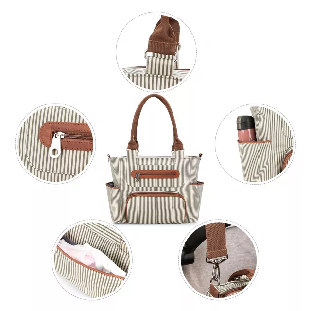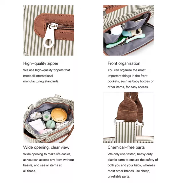 This set includes one spacious diaper tote bag along with six essential accessories: a changing pad, bottle bag, clothing bag, coin purse, small personal pouch, and two convenient stroller straps. The main bag features eleven thoughtfully designed pockets—perfect for storing diapers, wipes, bottles, snacks, toys, clothes, and even your tablet or laptop (up to 14 inches).