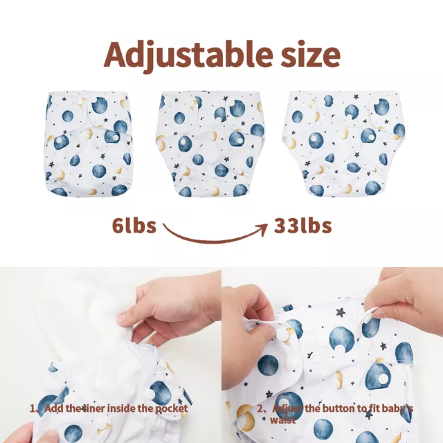 Make diaper changes simpler, cleaner, and more sustainable with this 9-pack of reusable cloth diapers. Designed for babies weighing between 6.6 and 33 lbs, these soft, waterproof diapers offer a comfortable fit from infancy through toddlerhood. Whether you’re at home or on the go, these washable diapers are made to keep your little one dry and your diaper routine hassle-free. With no harmful chemicals and a unisex design, this diapering set is safe, stylish, and built for everyday use.