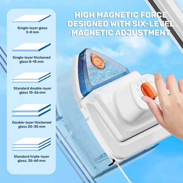• Six-level magnetic adjustment – Ensures a firm grip and reliable cleaning on single, double, or triple-layer glass.
