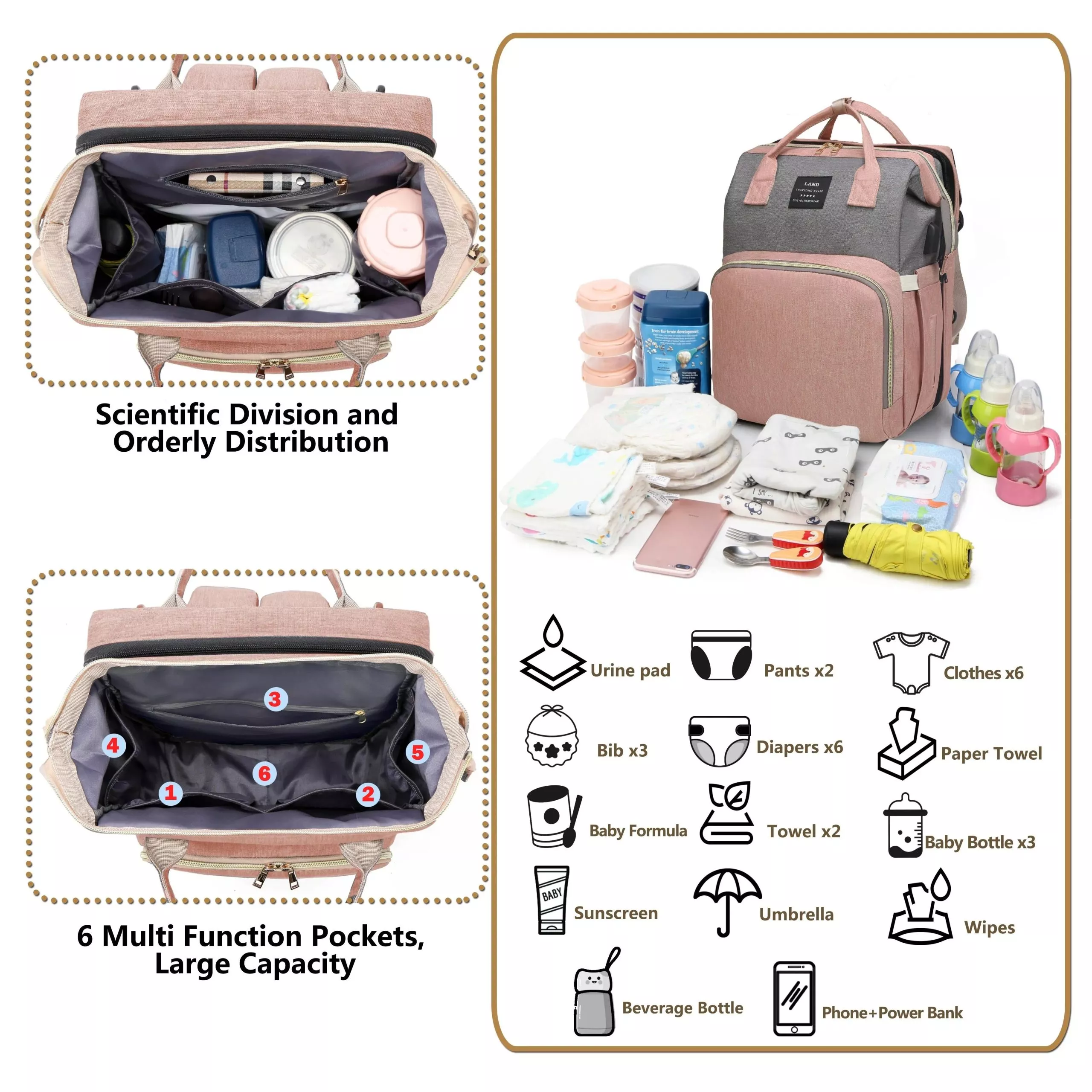 • Large capacity design with multiple compartments for bottles, diapers, clothes, wipes, and more