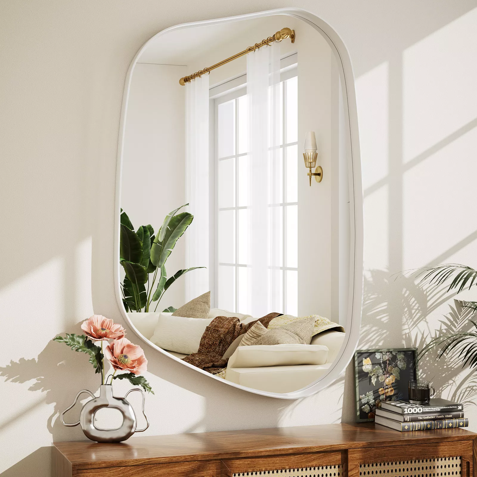 Crafted with a clean, deep frame and a fresh white finish, this irregular mirror turns simple reflections into focal points. Its generous 40 x 26 inch size makes it ideal for both function and decor. Built to mount securely on the wall, it’s an easy, self-contained installation—no extra framing or hassle required. The modern appearance and minimalist style create a sophisticated yet playful atmosphere that complements a variety of home aesthetics.