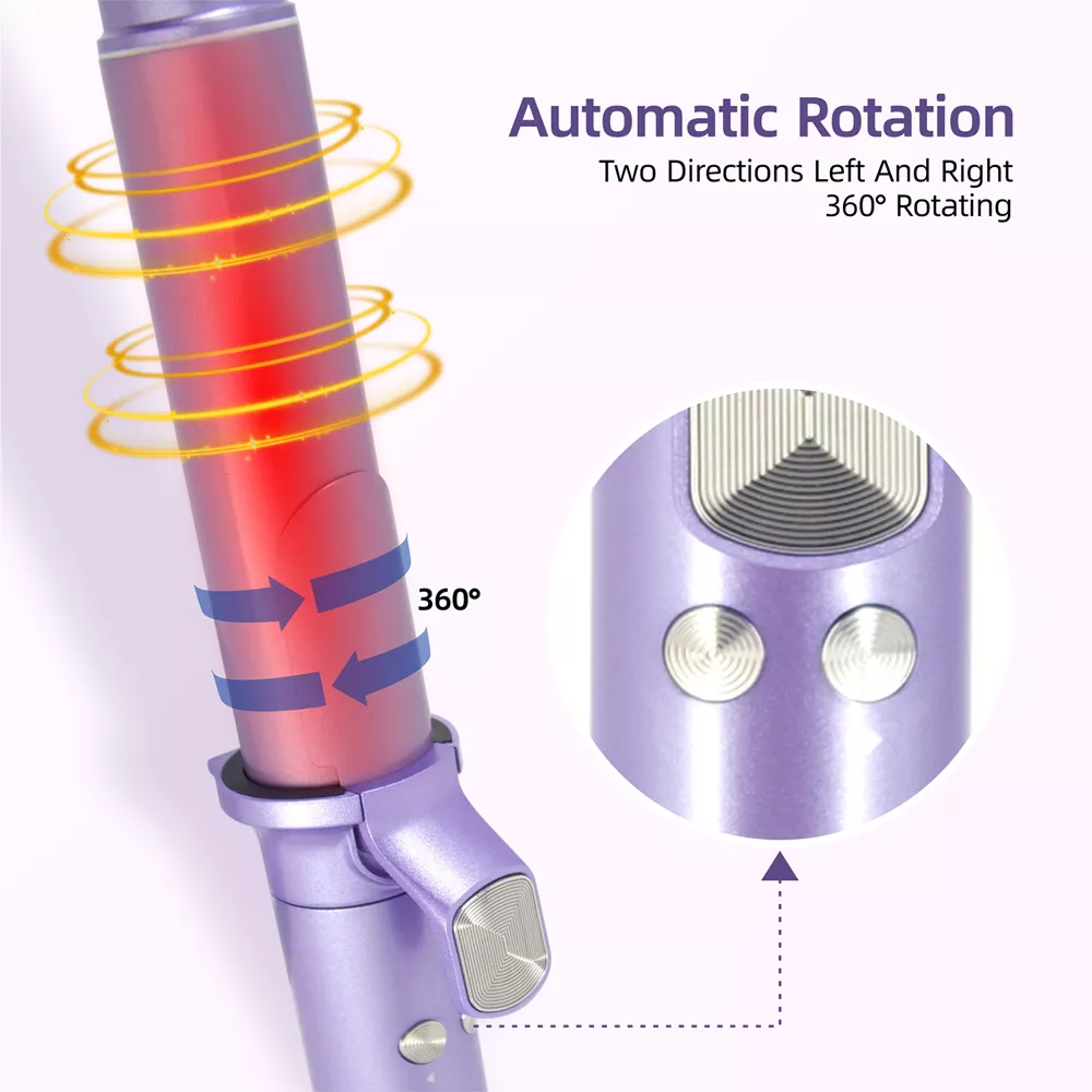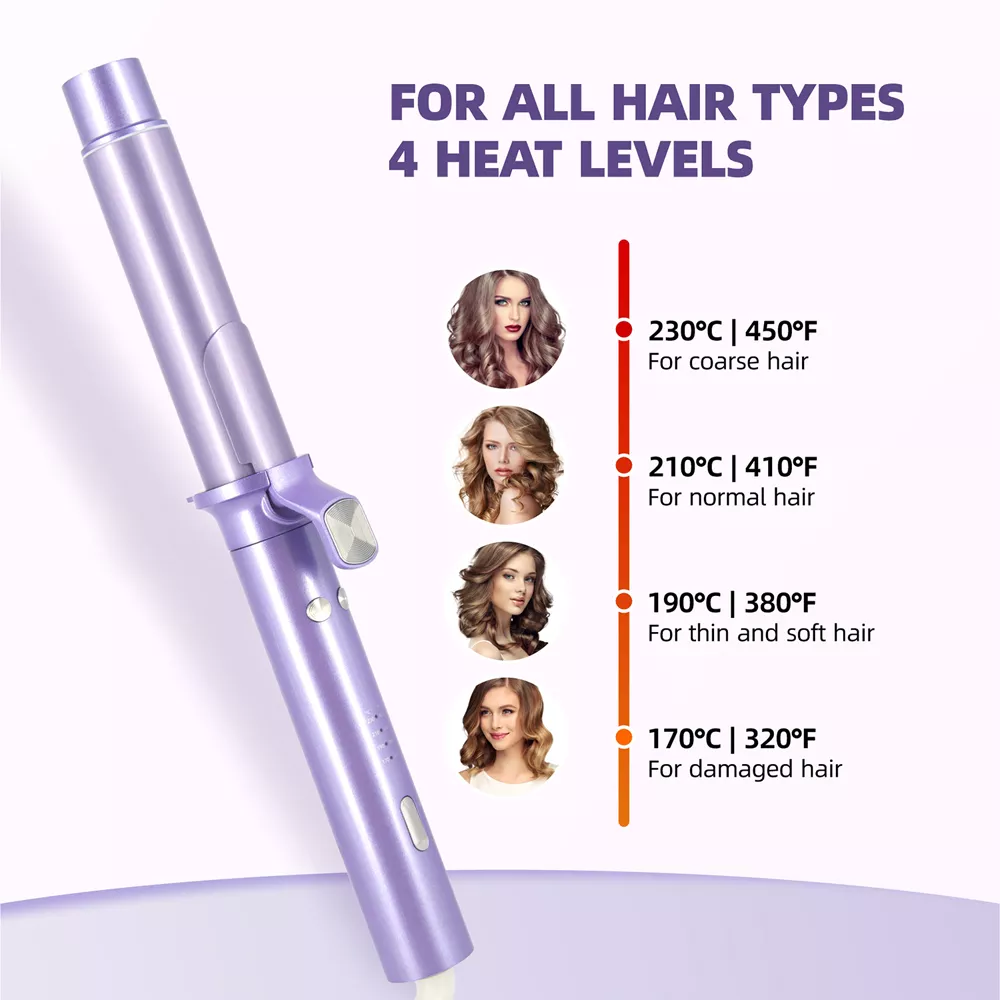 Featuring four adjustable heat settings — 320°F, 380°F, 410°F, and 450°F — this curling iron is ideal for every hair type. Whether your hair is fine, thick, dyed, or naturally wavy, you can easily select the right temperature for your styling needs. The 360° swivel cord lets you move freely without tangling, making it easy to curl from any angle.