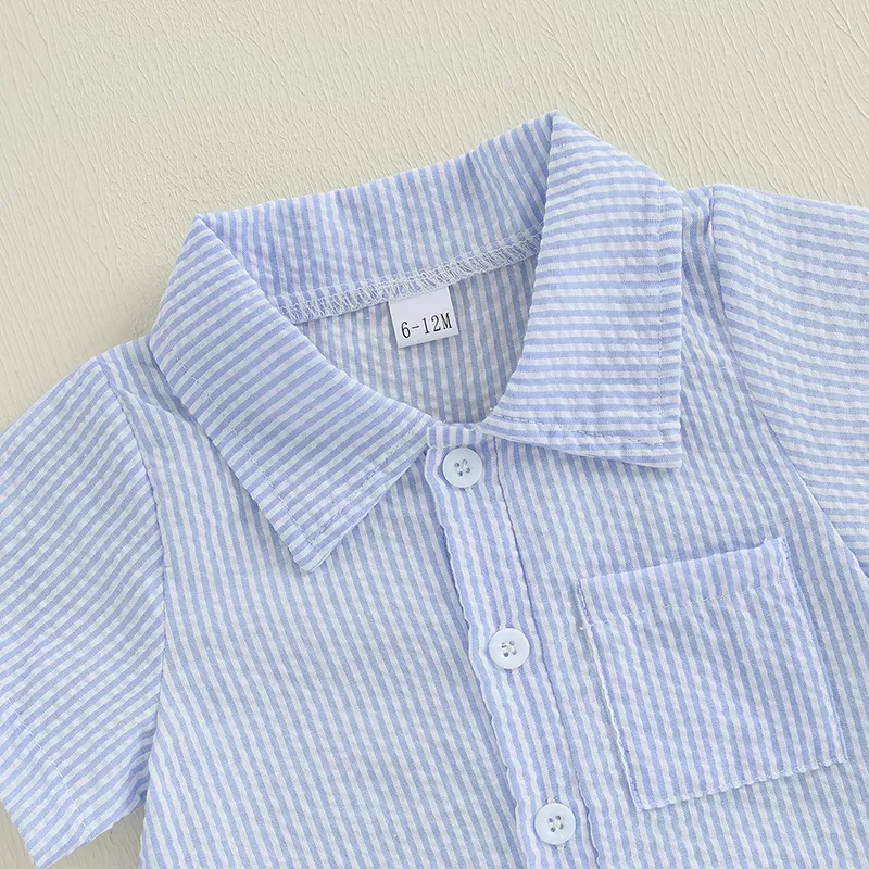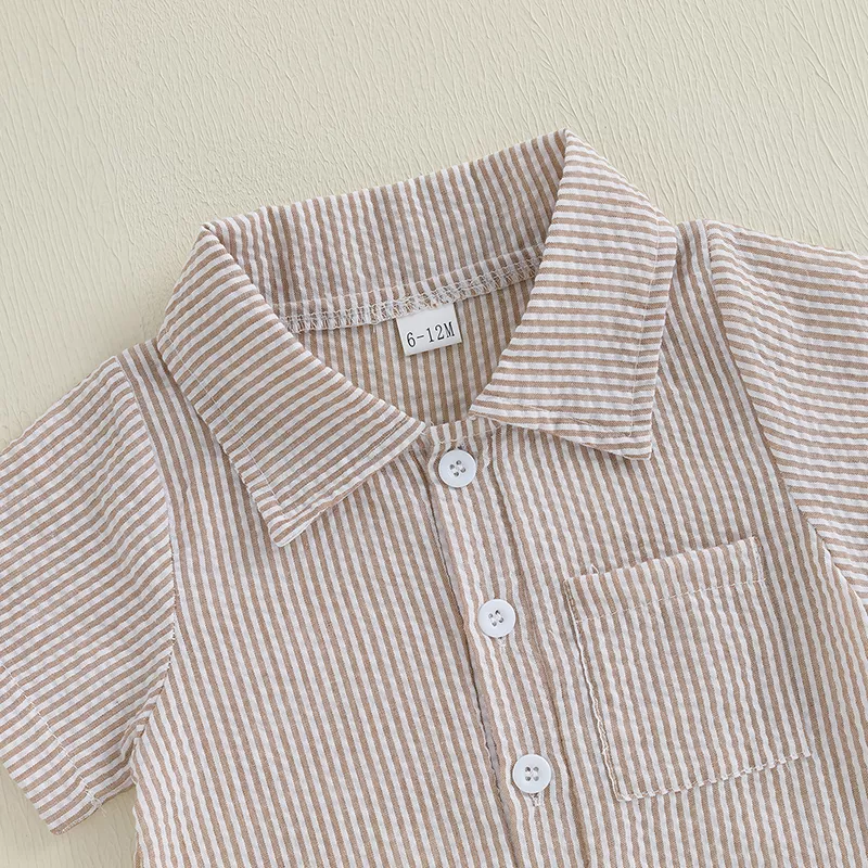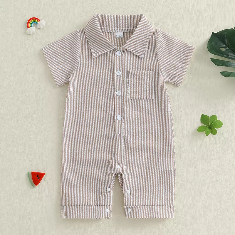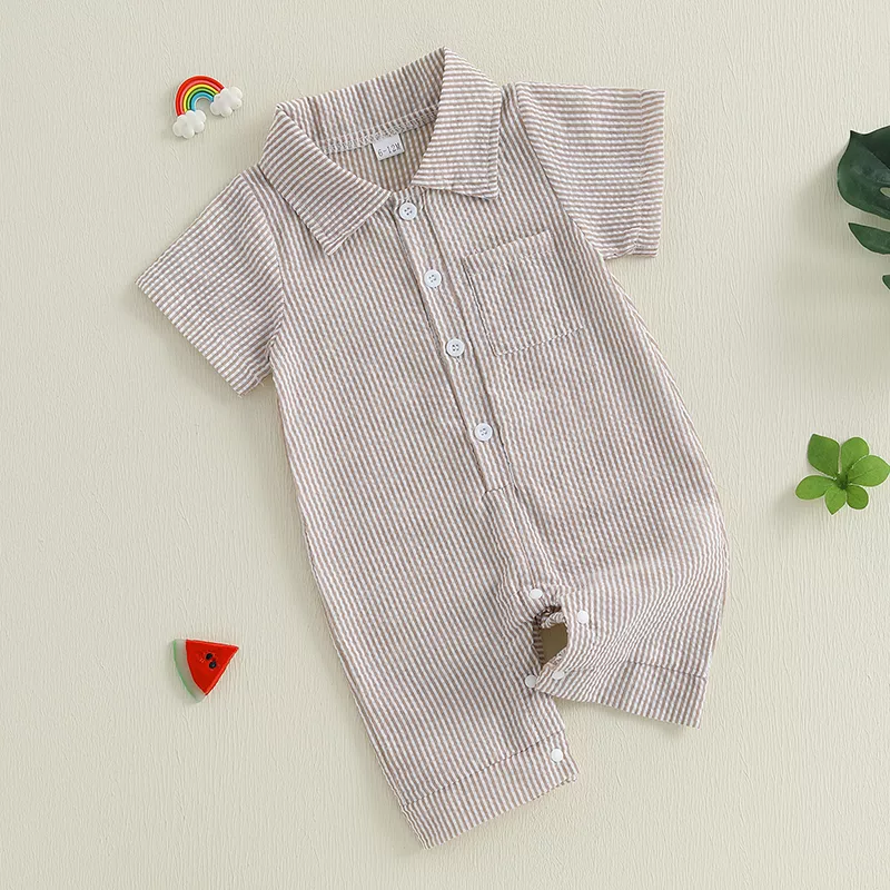 This romper is crafted from a high-quality cotton blend (65% cotton, 35% polyester), offering both softness and durability. The stylish striped pattern comes in versatile colors — khaki or blue — perfect for mixing and matching with baby essentials. The single-breasted half button-up design makes it simple to slip on and off, which every busy parent will appreciate. The lapel neck and short sleeves give this romper a smart, timeless look that’s perfect for summer adventures.