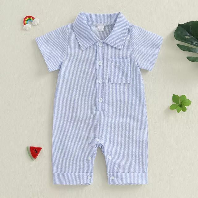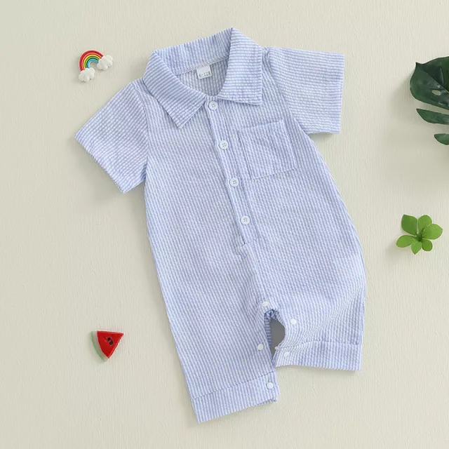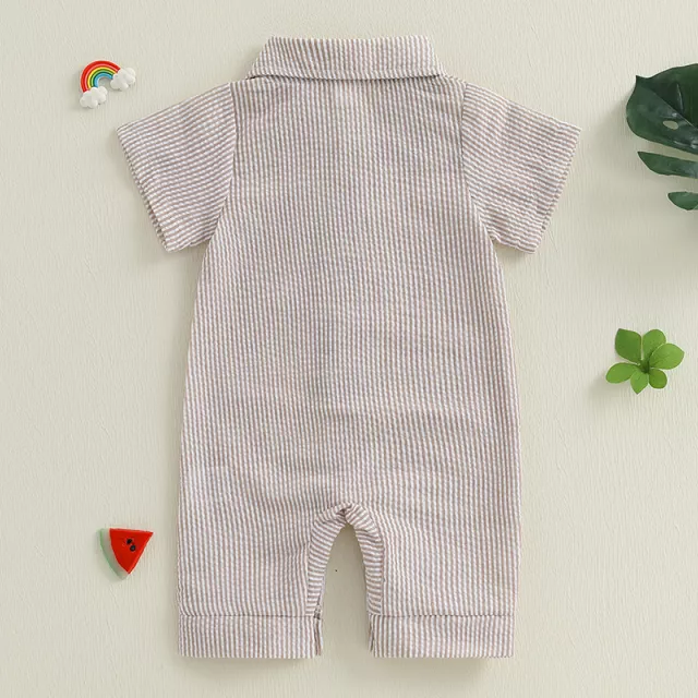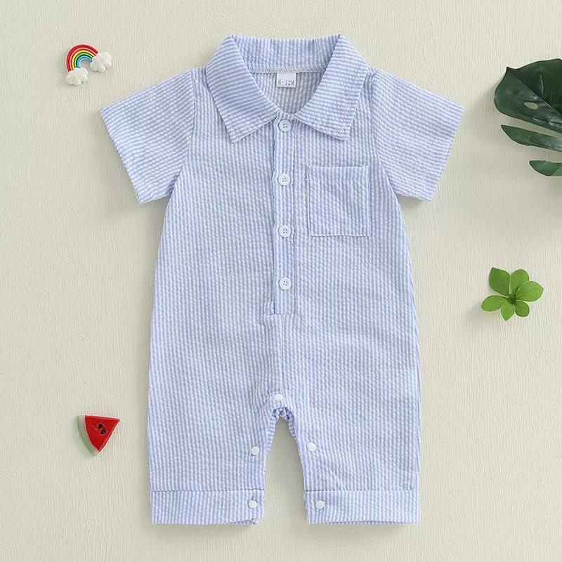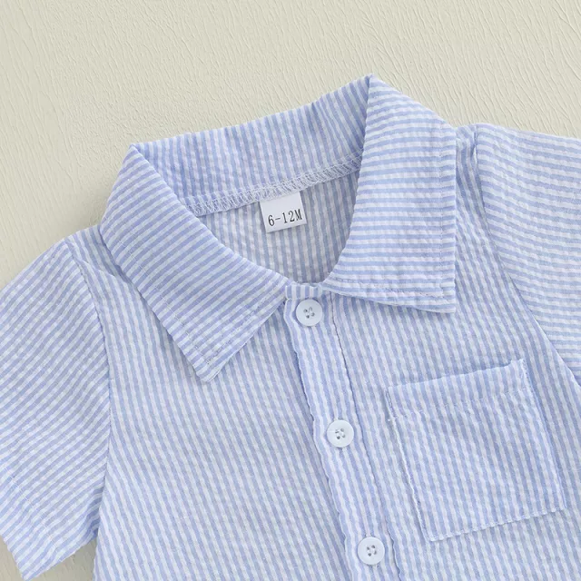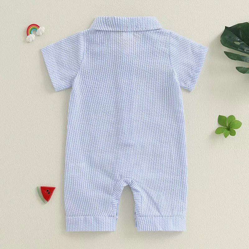 Give your little one a fresh and playful summer look with this charming striped baby boy romper. Designed with soft, breathable fabric, this half button-up romper is perfect for sunny days, family outings, or casual playdates. The classic lapel collar adds a touch of style, while the short sleeves keep your baby cool and comfy all day long. Whether you’re dressing him up for a special occasion or keeping it casual, this romper makes dressing quick and easy with its practical button-front closure.