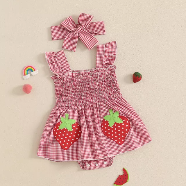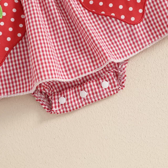 Make your baby girl’s summer even sweeter with this charming plaid romper dress set. This delightful 2-piece outfit features a soft, lightweight plaid romper with adorable strawberry embroidery and playful fly sleeves. Perfect for sunny days, family outings, photoshoots, or birthday parties, this romper brings a burst of color and joy wherever your little one goes. Paired with a matching headband, this look is simply irresistible and picture-perfect.