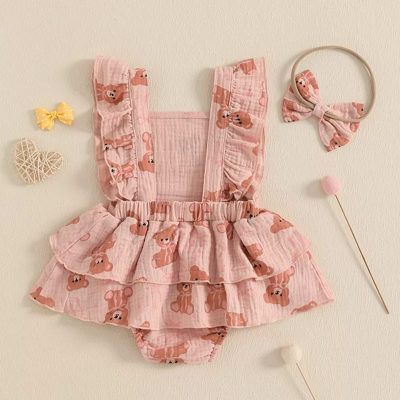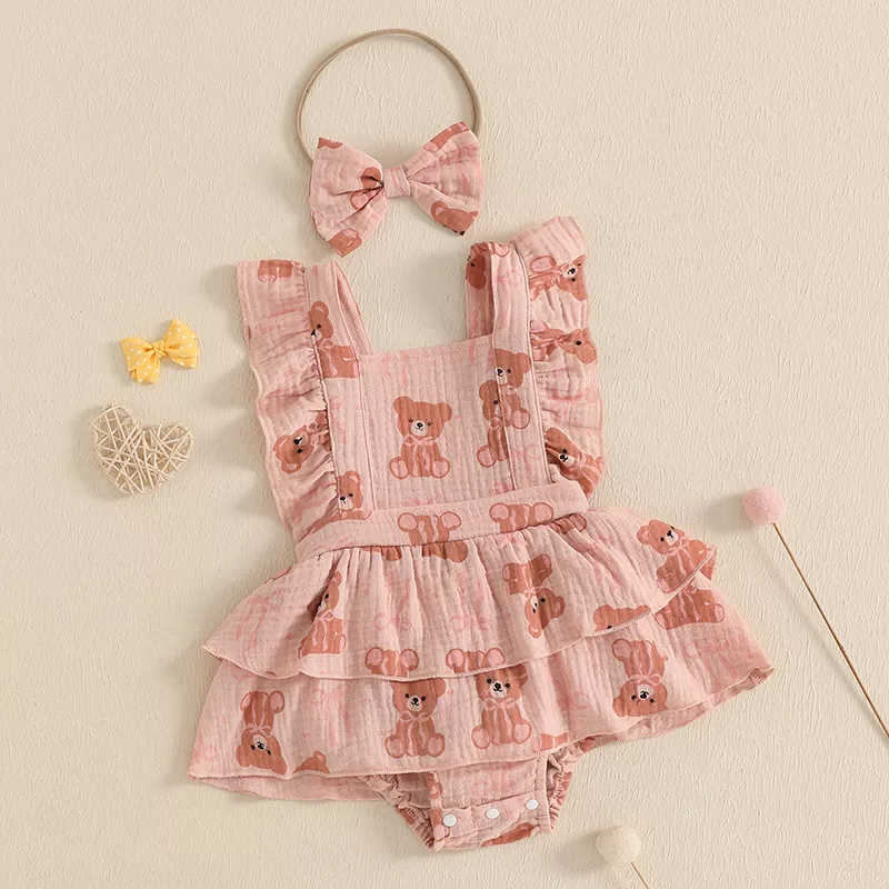 This romper combines comfort and cuteness effortlessly. The fabric feels lightweight, perfect for summer playtime, and the bear print is charming yet subtle. The headband matches beautifully, completing the outfit with style. It fits true to size and allows freedom of movement, making it ideal for daily wear or special occasions alike.