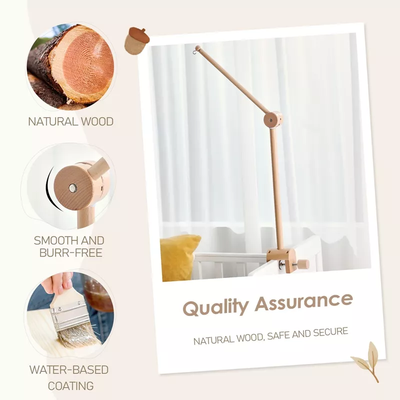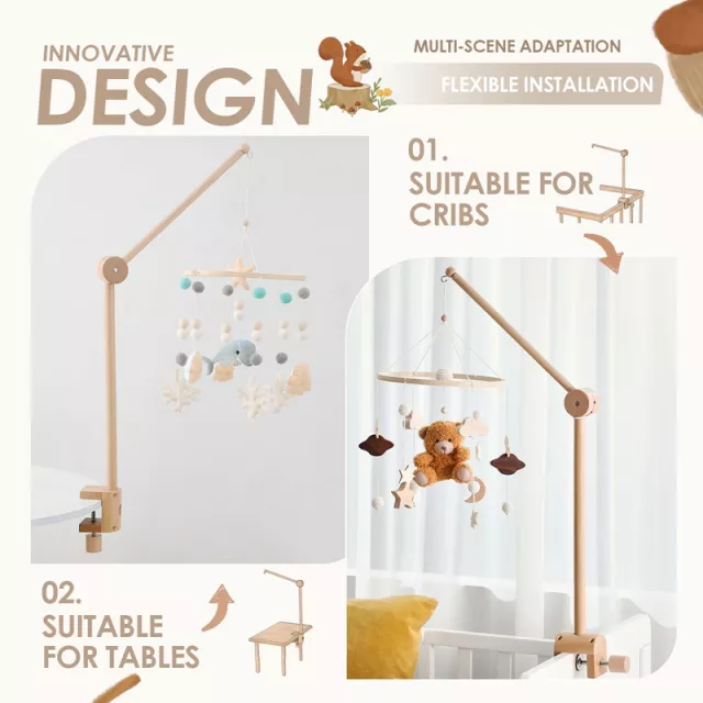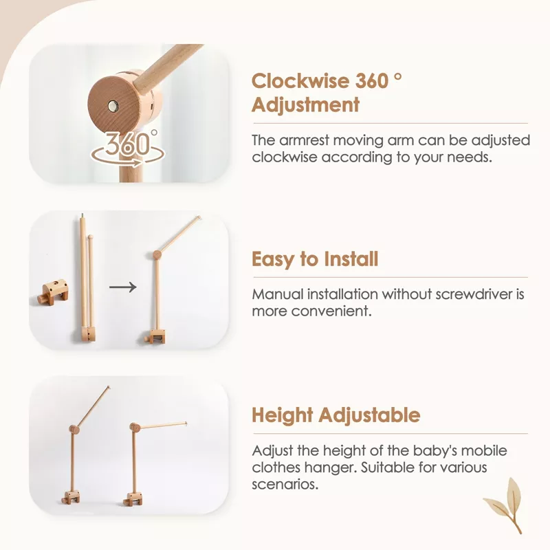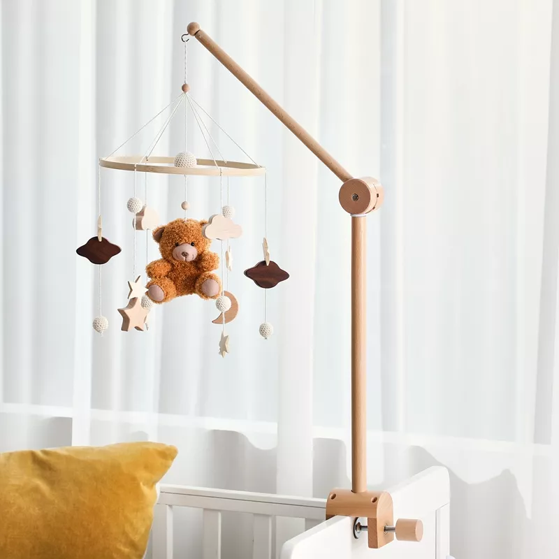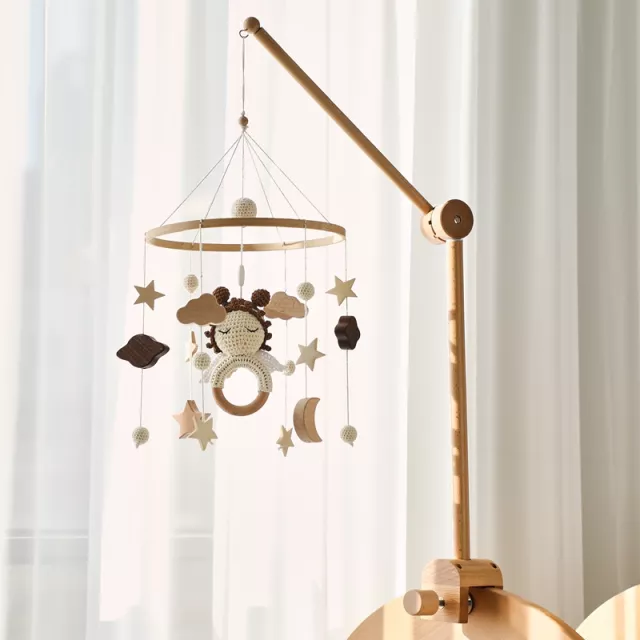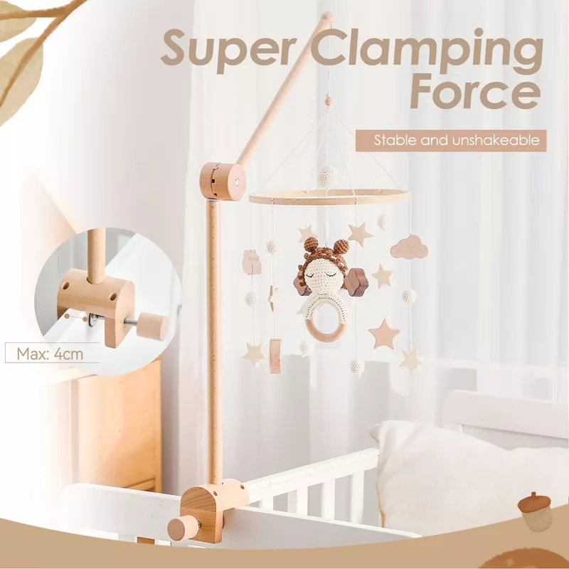 Introduce your little one to a world of sensory stimulation, joy, and developmental growth with the Baby Wooden Mobile Rattle Toy. Designed for infants from 0-12 months, this enchanting mobile turns every nap and playtime into a delightful experience. With a 360-degree height adjustment feature, easy-to-use mounting system, and a charming music box, this crib bell offers a perfect blend of entertainment and educational value for your baby. It’s time to engage your baby’s senses and foster crucial early milestones with this upgraded, multifunctional crib mobile.
