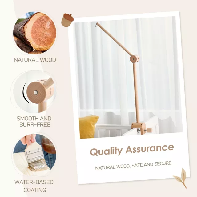 This thoughtfully designed toy not only adds a beautiful aesthetic to any nursery but also serves as an essential tool for stimulating your baby’s cognitive development. The wooden mobile features colorful hanging rattles, soothing music, and a secure, adjustable setup that grows with your baby. The gentle music box offers calming melodies that will soothe and pacify your baby, while the rotating design and rattling sounds stimulate both auditory and visual senses.