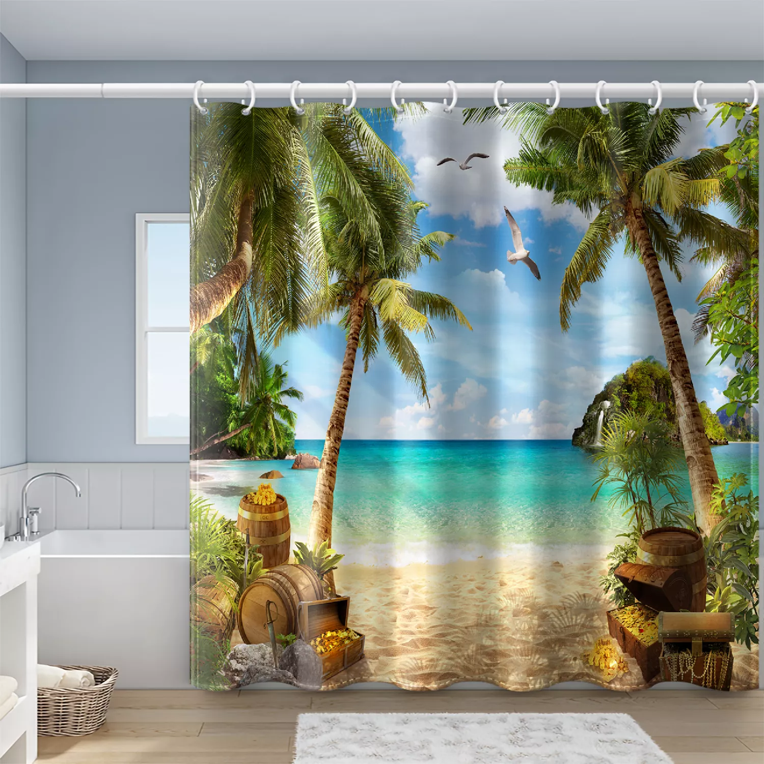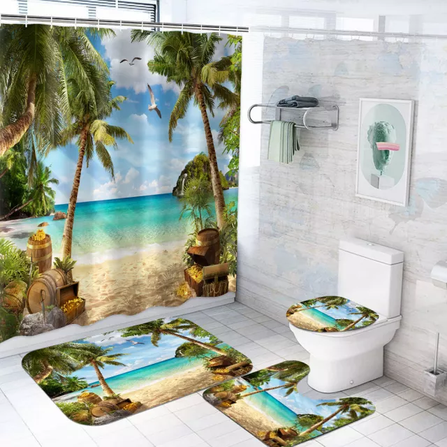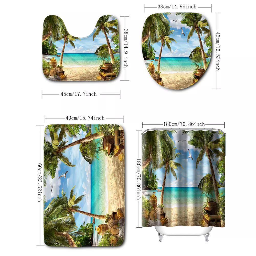 I love how this shower curtain set brings such a warm and relaxing vibe to my bathroom. The beautiful design featuring coconut trees and beach scenery truly gives off that vacation-like feel every time I step into my bath area. It's also worth mentioning that each piece in this set is made from premium-quality material ensuring longevity of use.