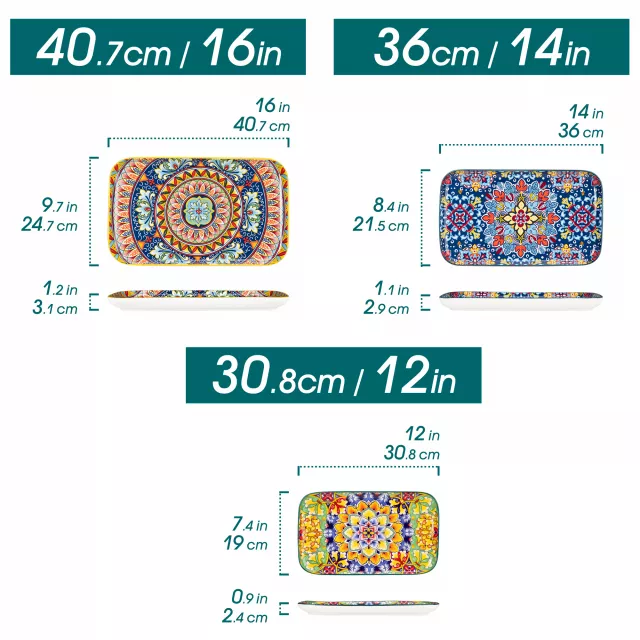 This set includes three rectangular plates in varying lengths—12, 14, and 16 inches. These dimensions offer maximum flexibility, perfect for a range of dishes including appetizers, salads, sushi rolls, sashimi, desserts, and more. The slightly raised edges not only enhance the visual appeal but also keep sauces and dressings from spilling, making your meals neat and mess-free.