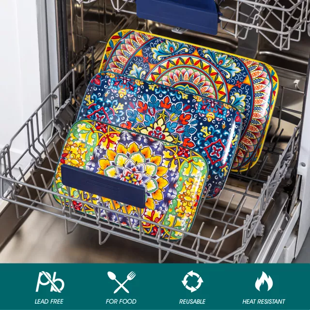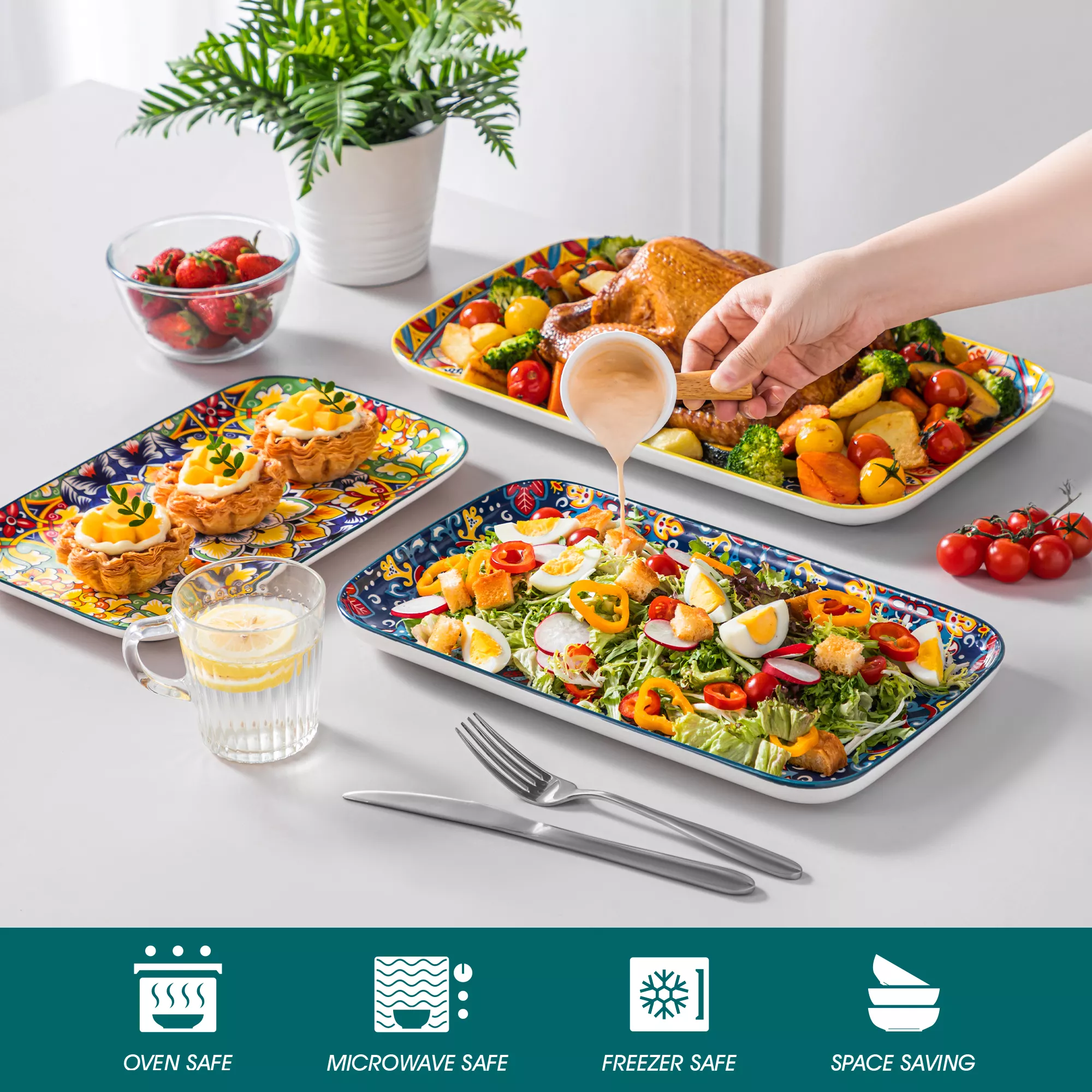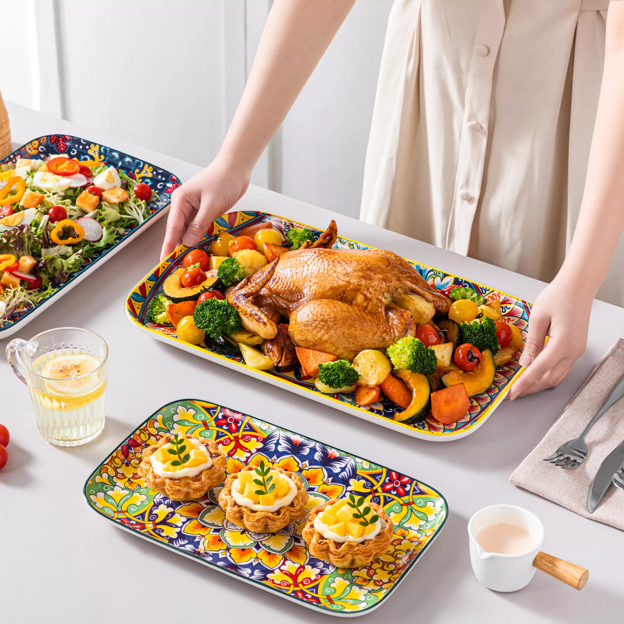 Make every meal feel like a special occasion with this beautifully crafted ceramic plate set. Designed with intricate Bohemian patterns, these rectangular plates bring a unique charm to your table setting. Whether you’re hosting dinner parties, plating desserts, or serving sushi at home, these plates are as practical as they are stunning. The detailed floral motifs and vibrant tones instantly elevate your food presentation, adding personality and style to your dining experience.