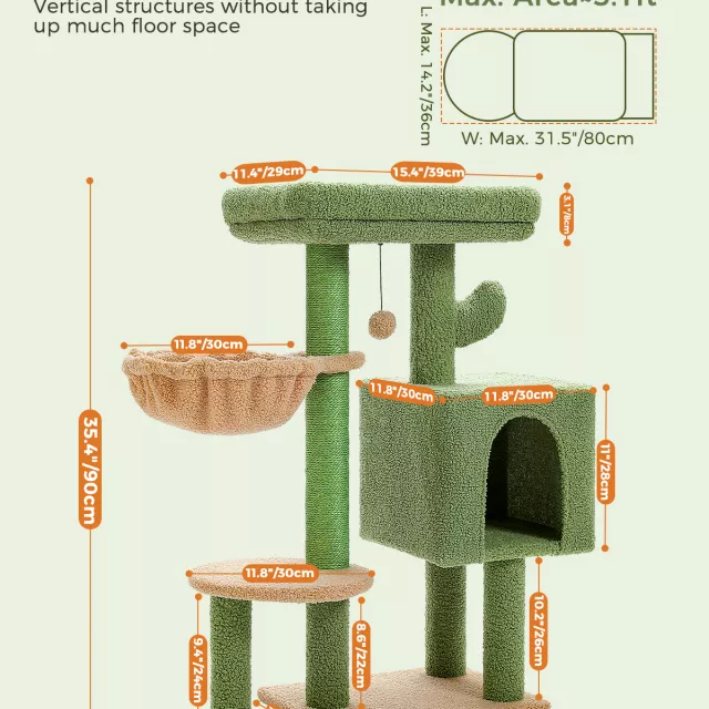 This cactus-style cat tree is more than just adorable—it’s built with your cat’s comfort and safety in mind. Standing 35.4 inches tall, the tower features a large padded perch on top, a cozy hammock below, and multiple sisal-covered scratching posts. The natural sisal helps keep your cat’s claws healthy and strong while protecting your furniture from scratching. A dangling plush ball adds a fun, interactive element your cat will love batting around.