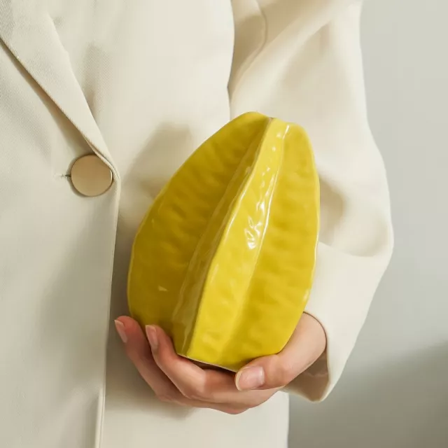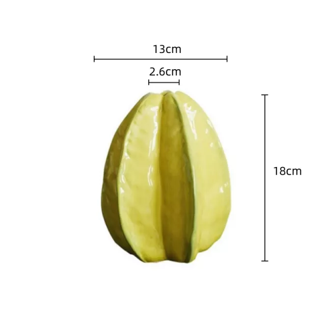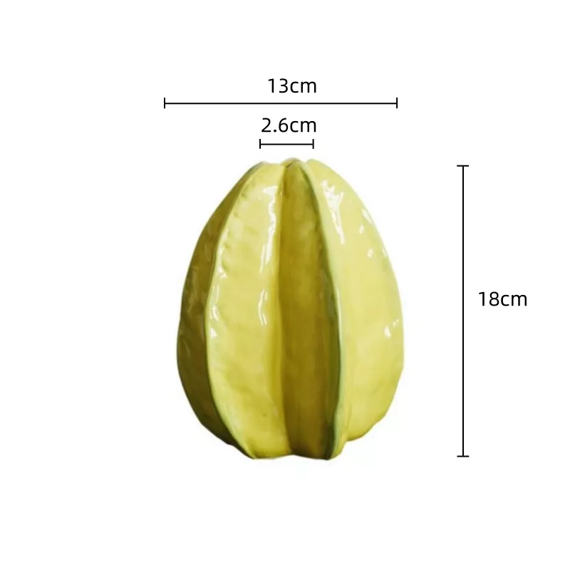 The vase is made of high-quality ceramic and porcelain materials, giving it a smooth texture and a glossy finish that reflects light beautifully. Measuring a perfect medium size, it’s ideal for tabletop displays, coffee tables, bookshelves, or windowsills. The realistic star fruit form gives it a sculptural appeal even when displayed without flowers, making it a versatile accessory for all seasons.
