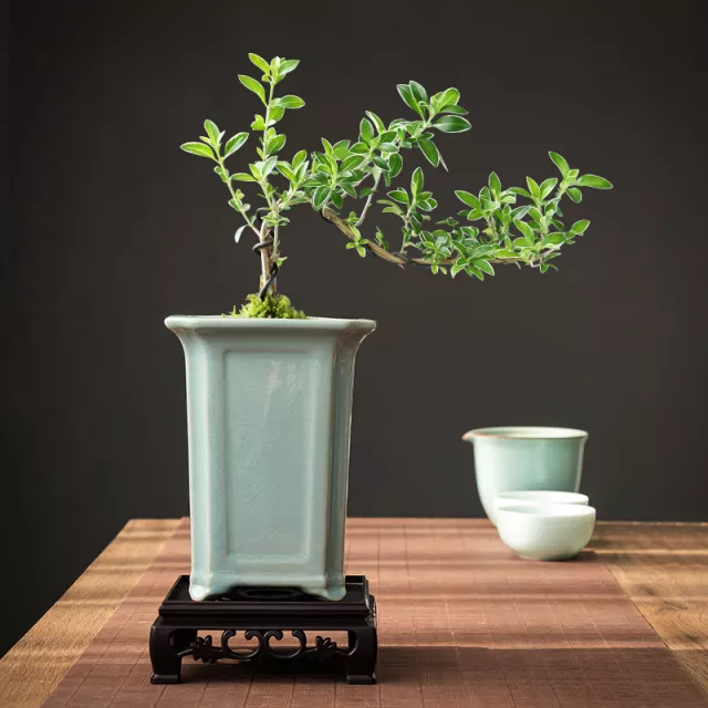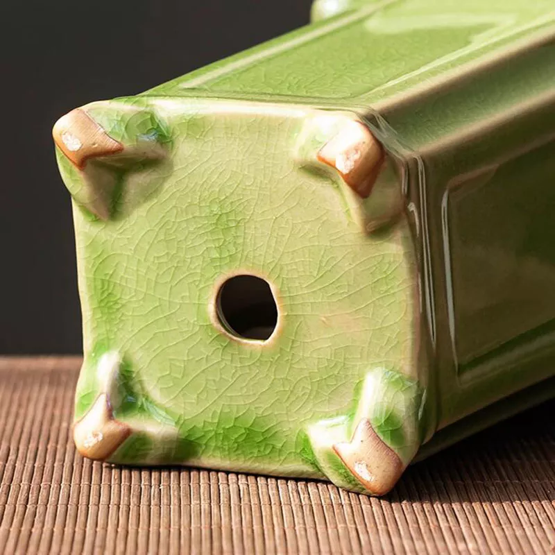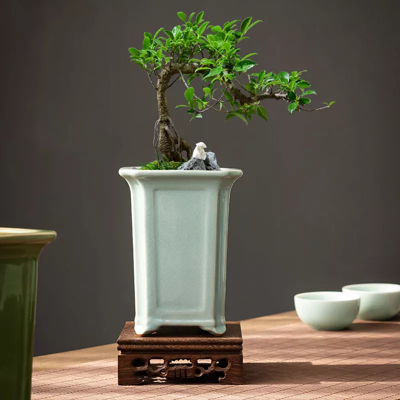 The soft green or blue glazed porcelain is artfully finished with the signature “ice crack” texture — a centuries-old ceramic technique that creates a network of fine lines on the surface, making each piece subtly unique. Whether used as a flowerpot, a mini bonsai container, or simply a stylish desktop ornament, this piece blends functionality with timeless beauty.