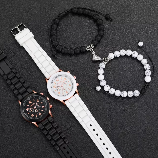 Celebrate love, friendship, or a special bond with this beautiful 4-piece set of couple watches and heart-shaped bracelets. Designed for women with a flair for fashion, these casual quartz wristwatches are a perfect match for everyday wear or special occasions. The sleek silicone band and classic Arabic numeral dial create a stylish look that complements any outfit. Whether you’re stepping out for a casual day, a date, or a social event, this set brings a touch of charm and unity to your style.
