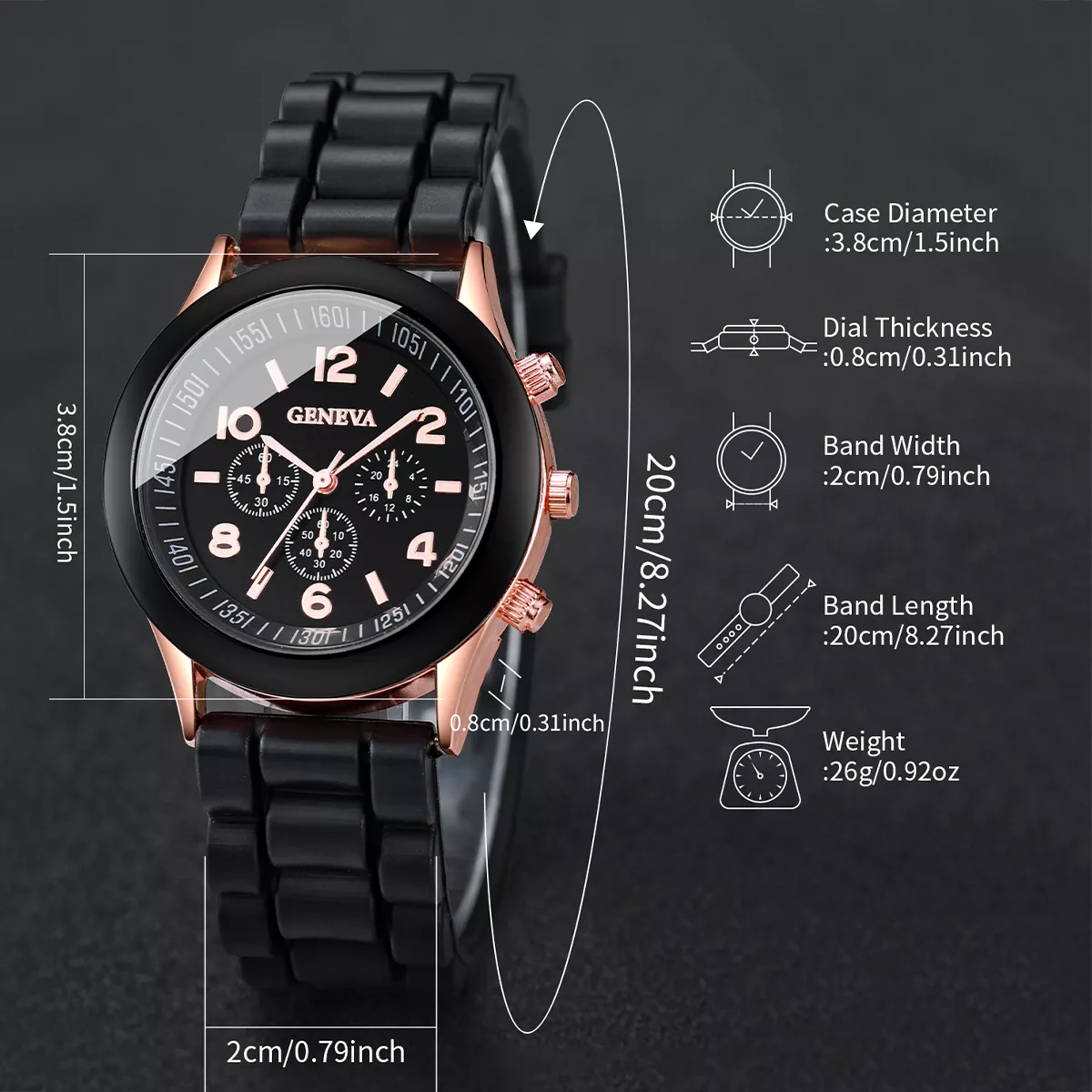 With a lightweight design and an adjustable 7.8-inch silicone strap, these watches offer a comfortable fit for all-day wear. The 1.5-inch alloy case adds a modern yet elegant touch, while the slim 0.3-inch profile makes them perfect for pairing with your favorite bracelets or bangles. The reliable quartz movement ensures you’ll always be on time, with precise and accurate timekeeping you can count on. The easy-to-read Arabic numeral markers make checking the time effortless, wherever your day takes you.
