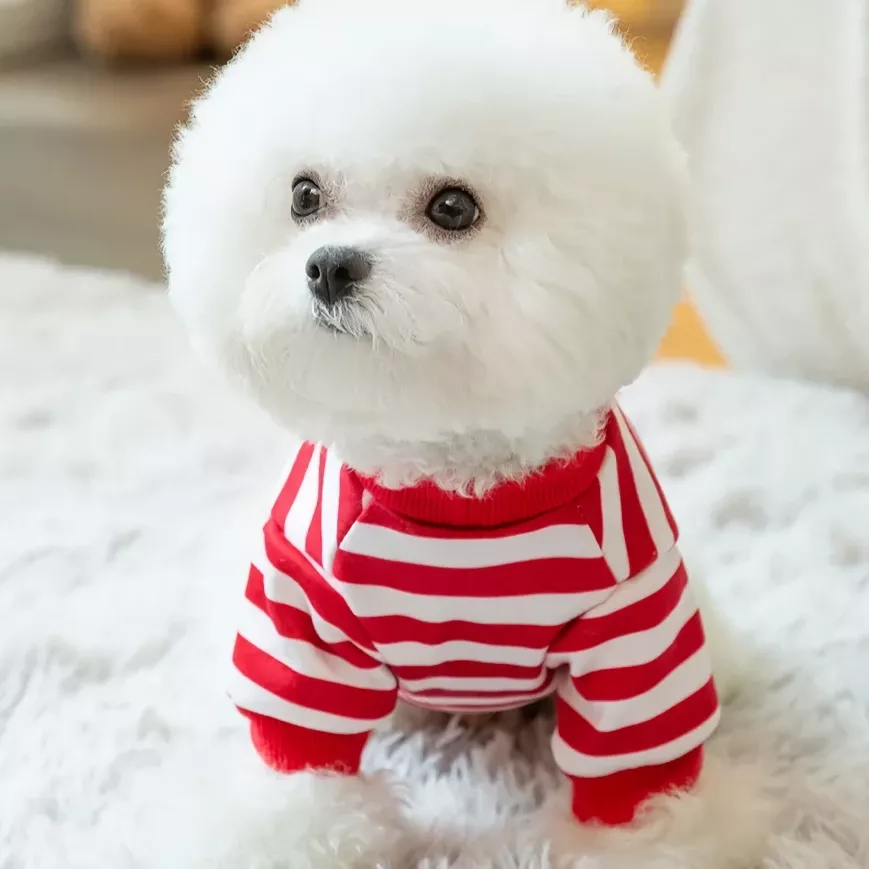 With a minimalist striped design that is both stylish and understated, this cozy pet sweater has been an absolute hit for my little buddy. The soft polyester fabric feels gentle against his fur, providing him with comfort while also keeping him warm during the colder fall and winter days. What's more, the easy pull-on style makes it a breeze to put on and take off without any hassle. My pup seems to love wearing his new outfit as much as I enjoy seeing him in it – he struts around proudly showing off his fashionable attire to anyone who will pay attention.
