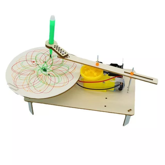 Unlike ordinary art tools, this unique robot combines science, motion, and design. Using the energy from a standard battery, the motor powers a belt-driven pulley system that moves a brush in a mesmerizing oval pattern. As the wooden disc rotates on a fixed axis, intricate and fascinating patterns begin to emerge. Kids can adjust the belt speed and modify the angles of the connecting parts to change brush paths and create entirely new designs — making each drawing session a fresh discovery.