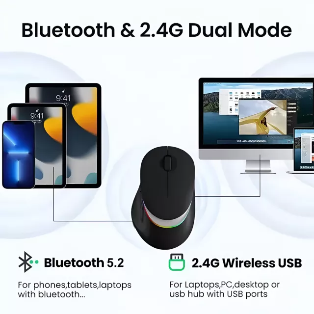 Upgrade your everyday computing with a sleek and powerful wireless mouse that’s built for comfort, speed, and precision. This dual-mode wireless mouse combines Bluetooth 5.2 and 2.4G connectivity for seamless switching between devices. Whether you’re working, gaming, or streaming, this mouse delivers smooth, reliable performance within a 33-foot range.