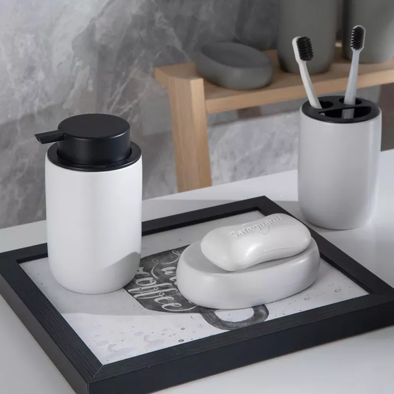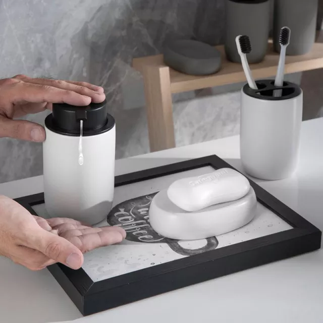 Perfect for both everyday use and when entertaining guests, this versatile set includes a mouthwash cup, hand sanitizer or soap dispenser bottle, toothbrush rack, and soap dish. With everything you need in one coordinated collection, it takes the hassle out of hunting for matching pieces and instantly elevates the look of your bathroom.