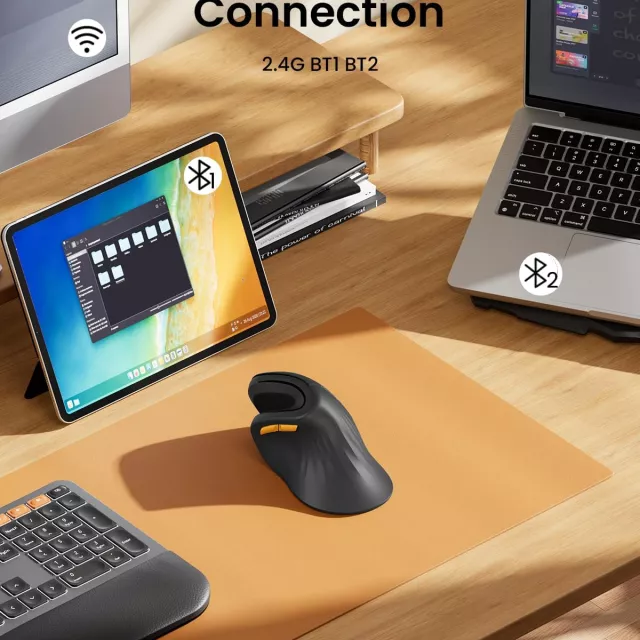 This mouse is a lifesaver for me. I've been dealing with wrist pain from my old traditional mouse and this vertical one has made such a difference! It's so comfortable to use, takes the pressure off my wrist, and it even connects to 3 devices simultaneously which is super handy when I'm juggling between work and personal tasks. Plus, being rechargeable means no more hunting for batteries. A great investment in comfort and productivity!