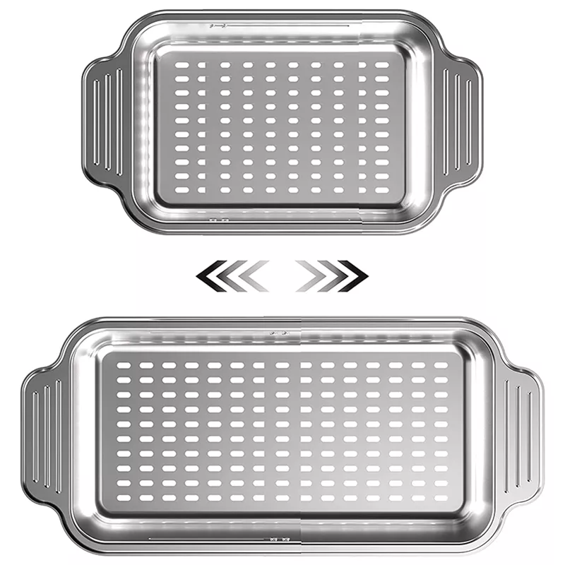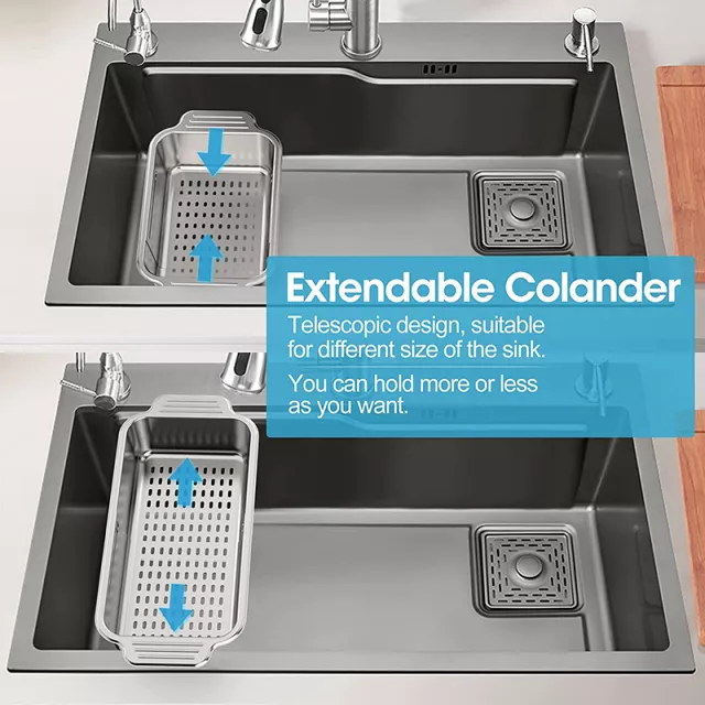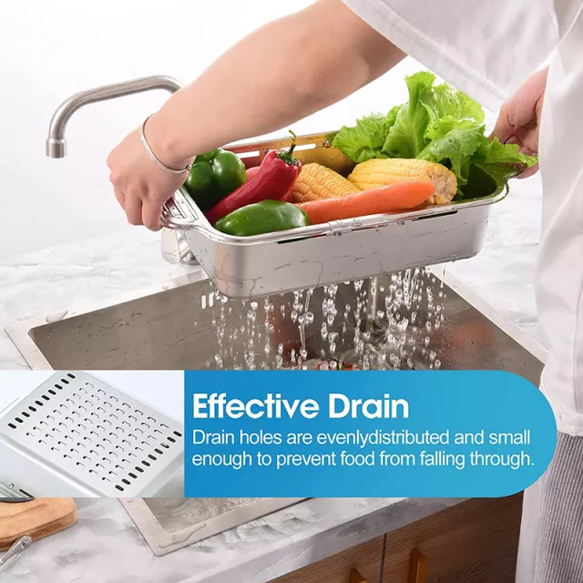 This colander is crafted from high-quality 304 stainless steel, making it rust-resistant, non-toxic, and heat-resistant — a smart alternative to silicone or plastic versions that can warp or melt. Its extendable arms glide smoothly to fit over a variety of sink sizes, offering hands-free convenience while you wash, rinse, or drain. The fine, evenly spaced holes make draining quick and efficient, preventing water from pooling and food from slipping through.